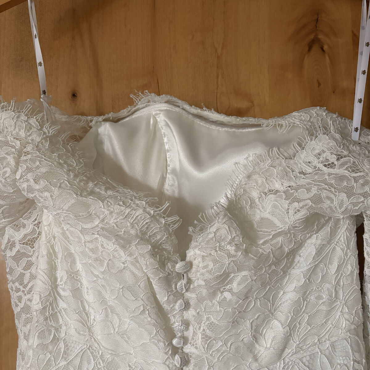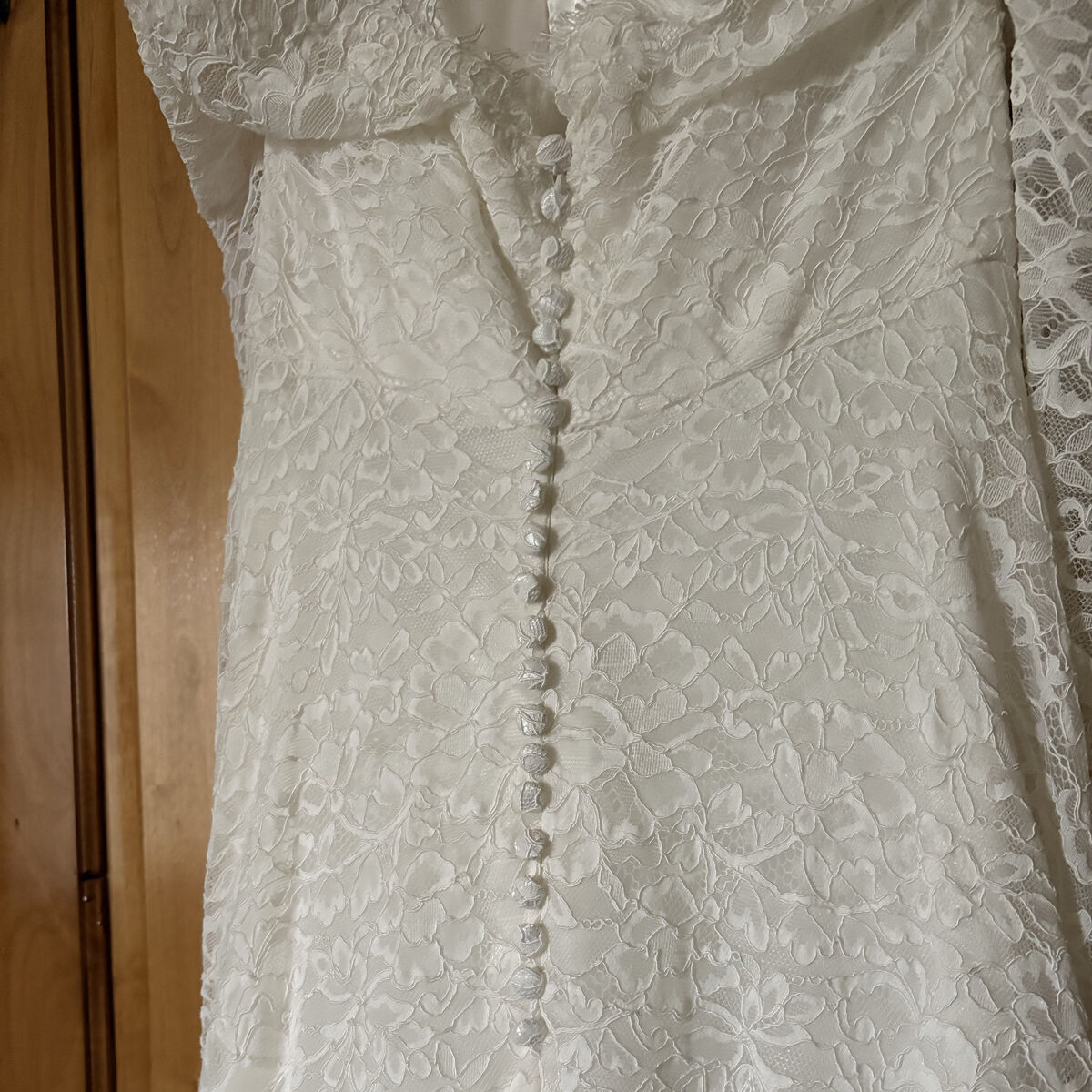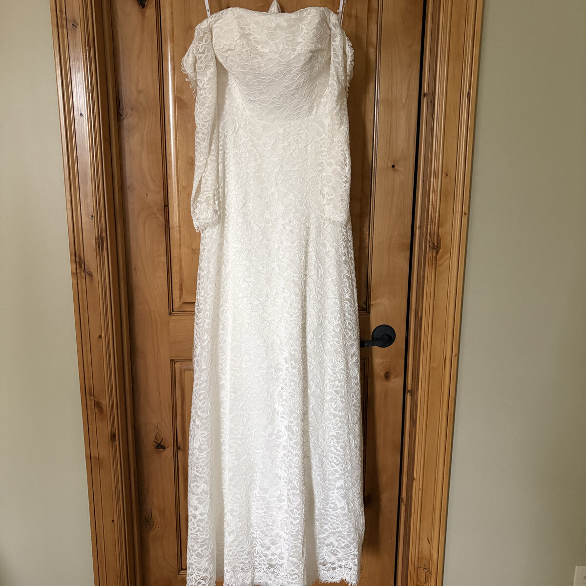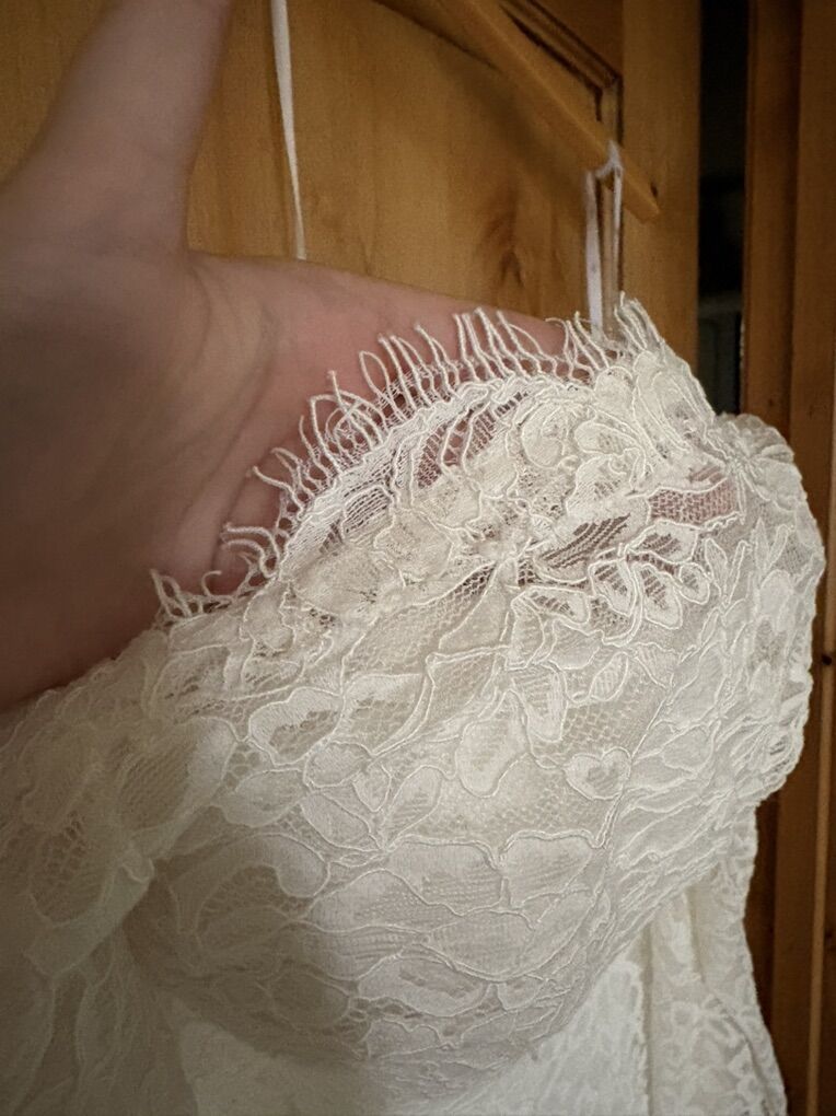 VenmoStunning all-lace wedding gown featuring a timeless off-the-shoulder neckline and romantic long sleeves. The dress has a flattering A-line skirt and is fully lined for comfort and coverage. Delicate lace detailing throughout gives this gown an elegant, refined look that photographs beautifully.