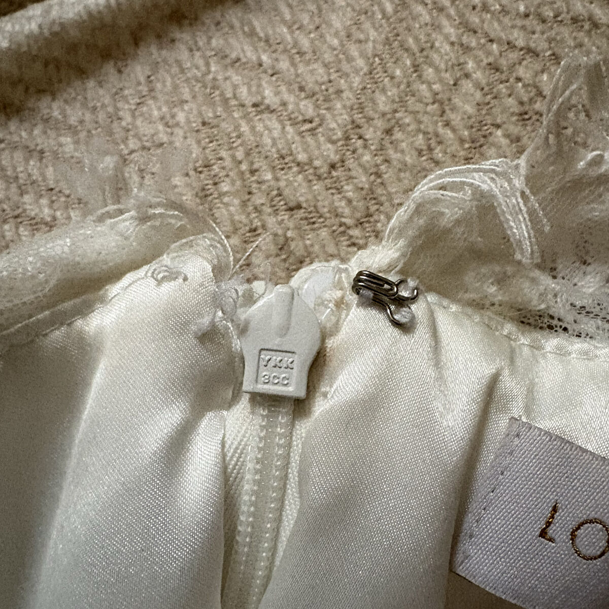 For reference I am usually a size medium 8/10 in street clothes. It is missing an eye for the hook and eye. Will come in a dress bag.