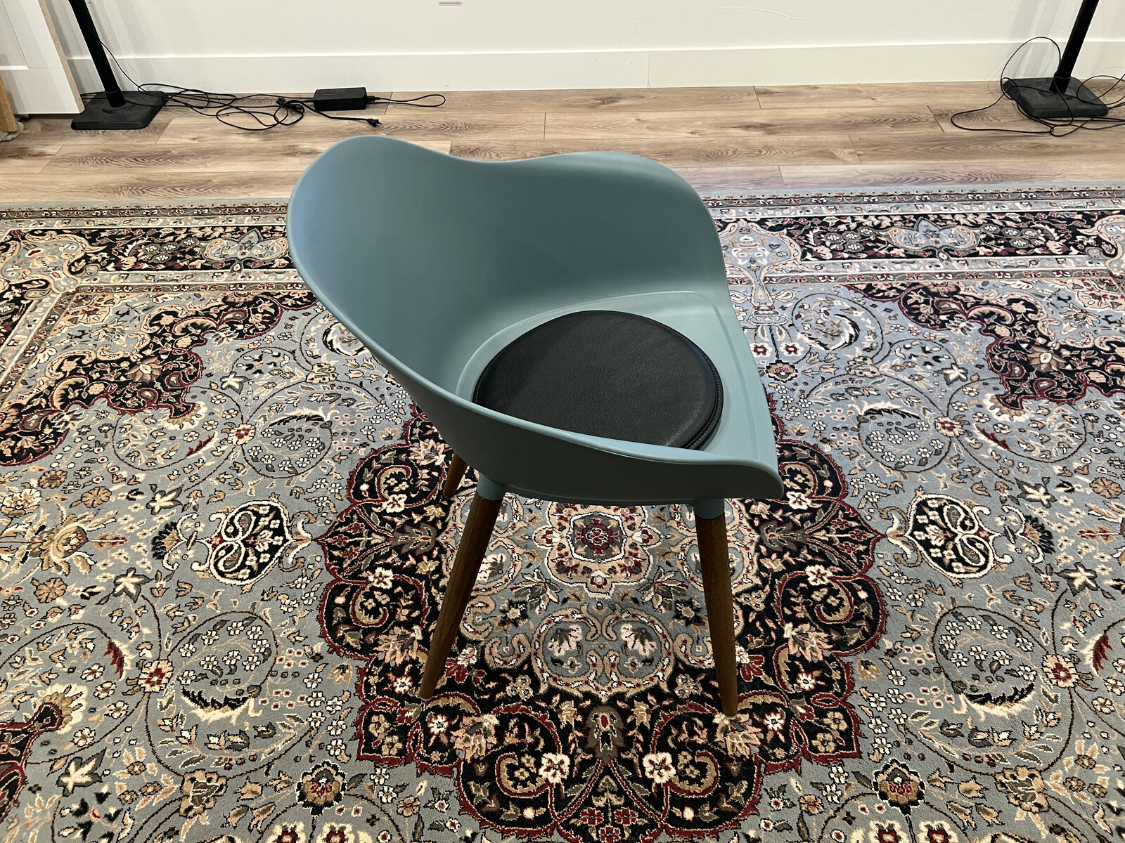 Molded polypropylene seat with solid eucalyptus legs — stylish and easy to clean.