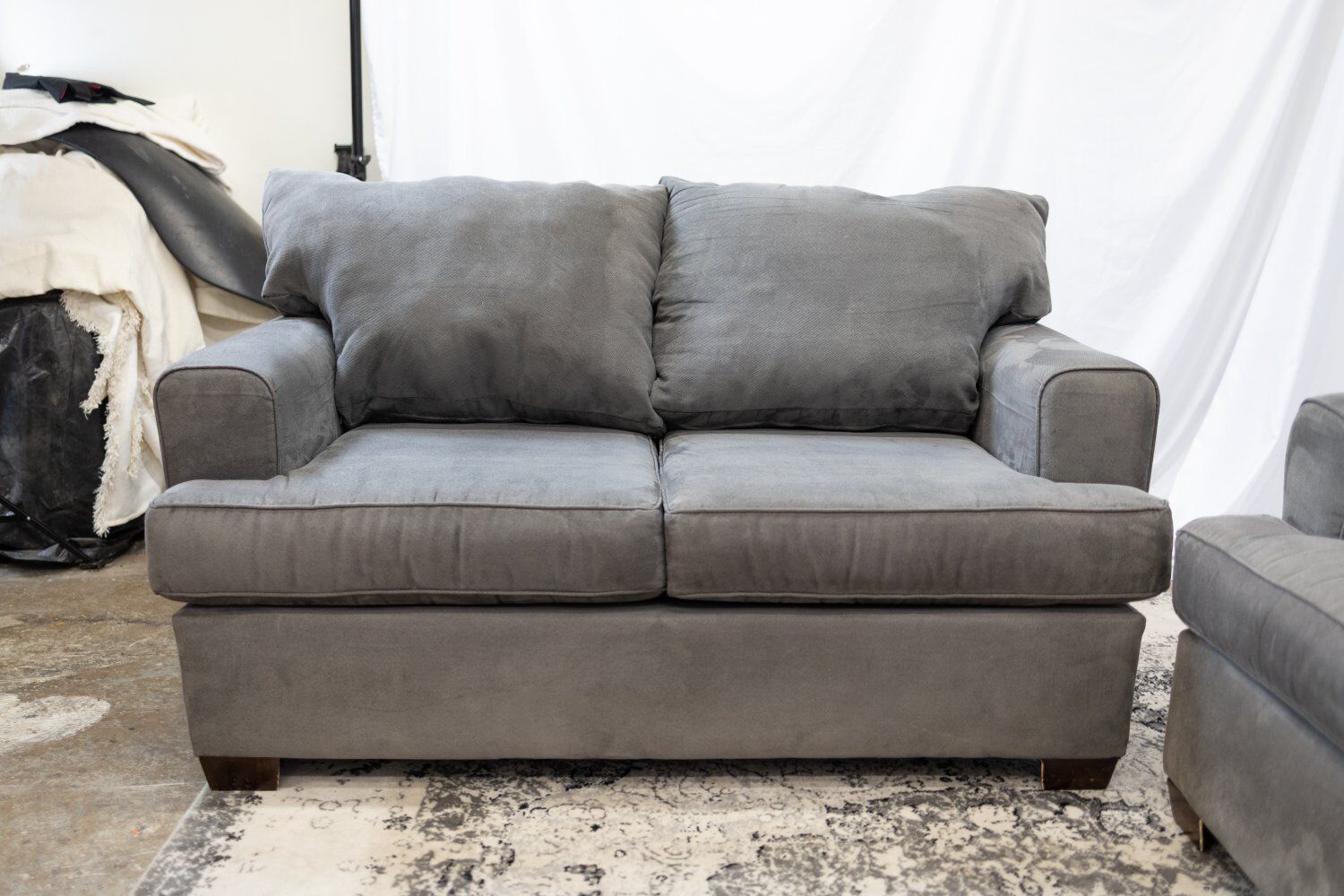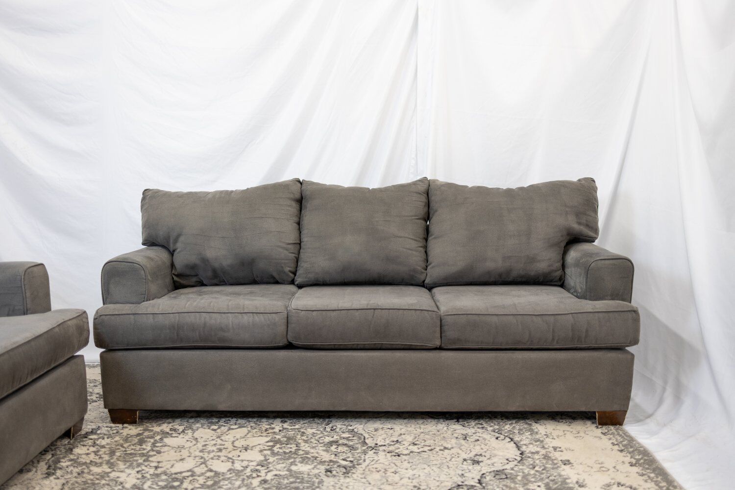 ZelleSelling a matching charcoal gray sofa and loveseat set from Ashley Furniture. The material is a soft, textured chenille fabric (not microfiber!) that is very comfortable and holds up well. This set has a contemporary, clean-lined look with flared arms and plush, deep cushions. It’s a great neutral set that works well with any rug or decor. Condition Good Used Condition: Sturdy and very comfortable. Wear: Shows some light, normal wear and tear from use, but overall well-maintained. Smoke-free home. Dimensions Sofa (Large): 84" L x 37" W x 30" H Loveseat (Small): 56" L x 37" W x 30" H