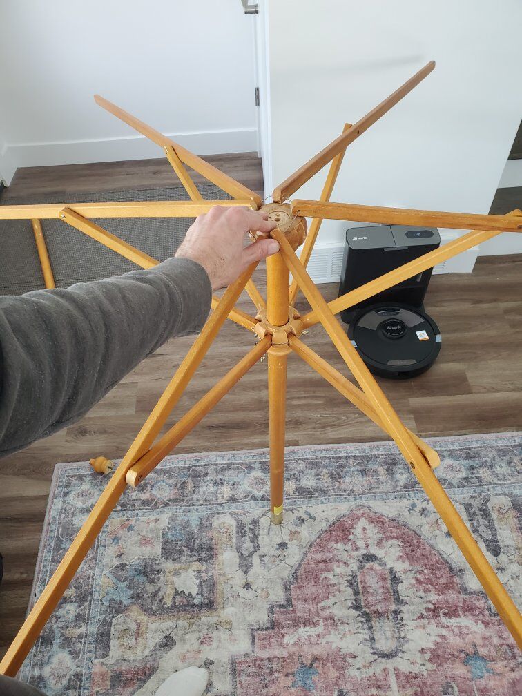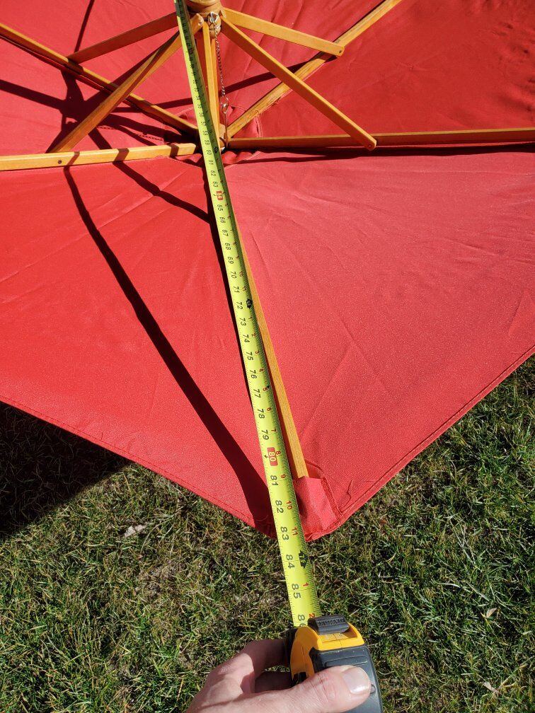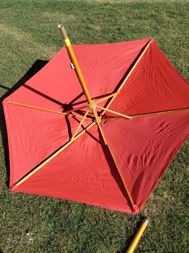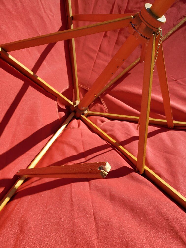 Patio umbrella works great but needs repaired. Was going to fix it but I've got other projects to work on. Needs some new screws for the finial mount as well as repairing one of the wood cross braces that has cracked. Umbrella canvas is clean and washed. Does not include a base/stand