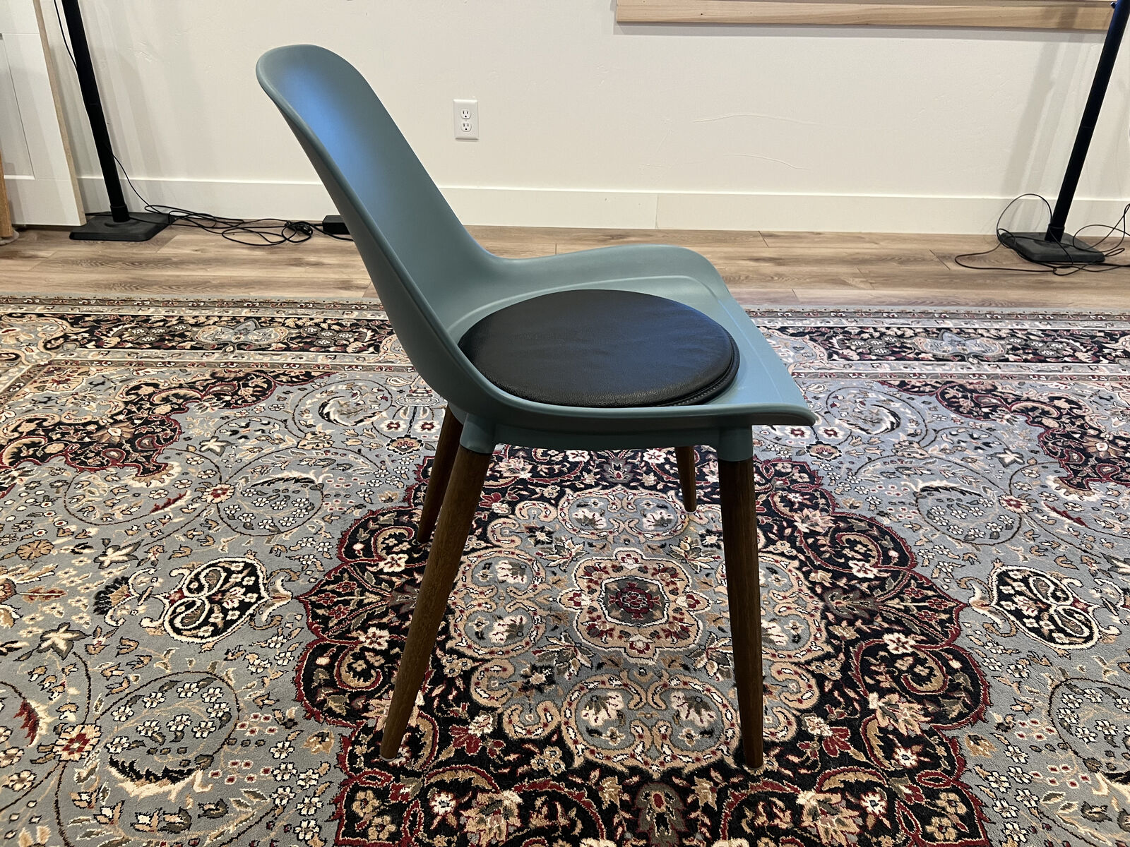 Molded polypropylene seat with solid eucalyptus legs — stylish and easy to clean.