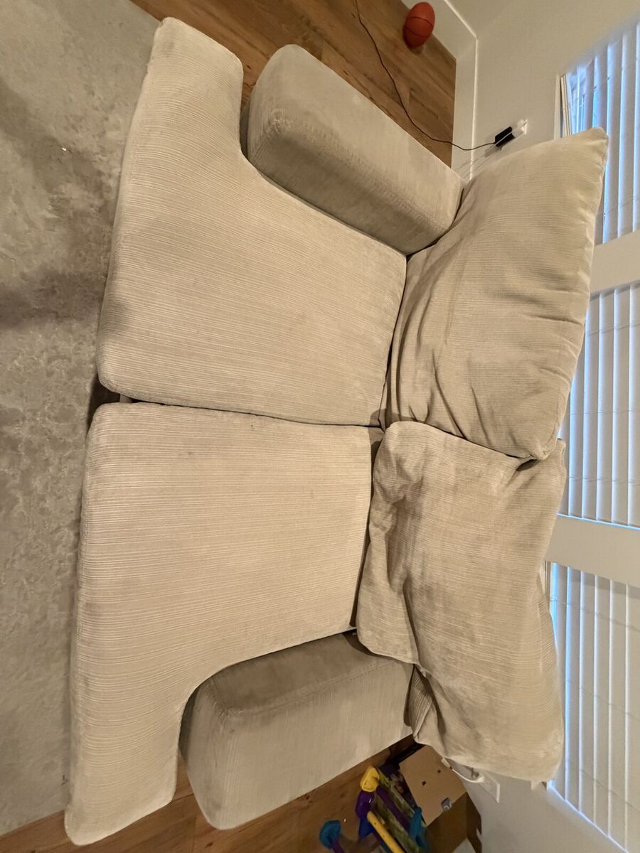 These are well used. A matching full size couch and loveseat combo. The cushion covers and back pillow covers are machine washable.