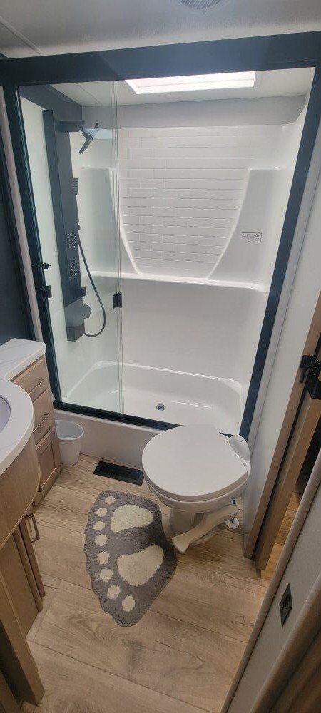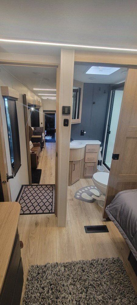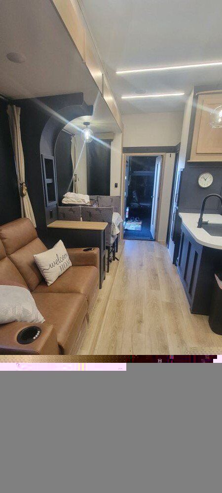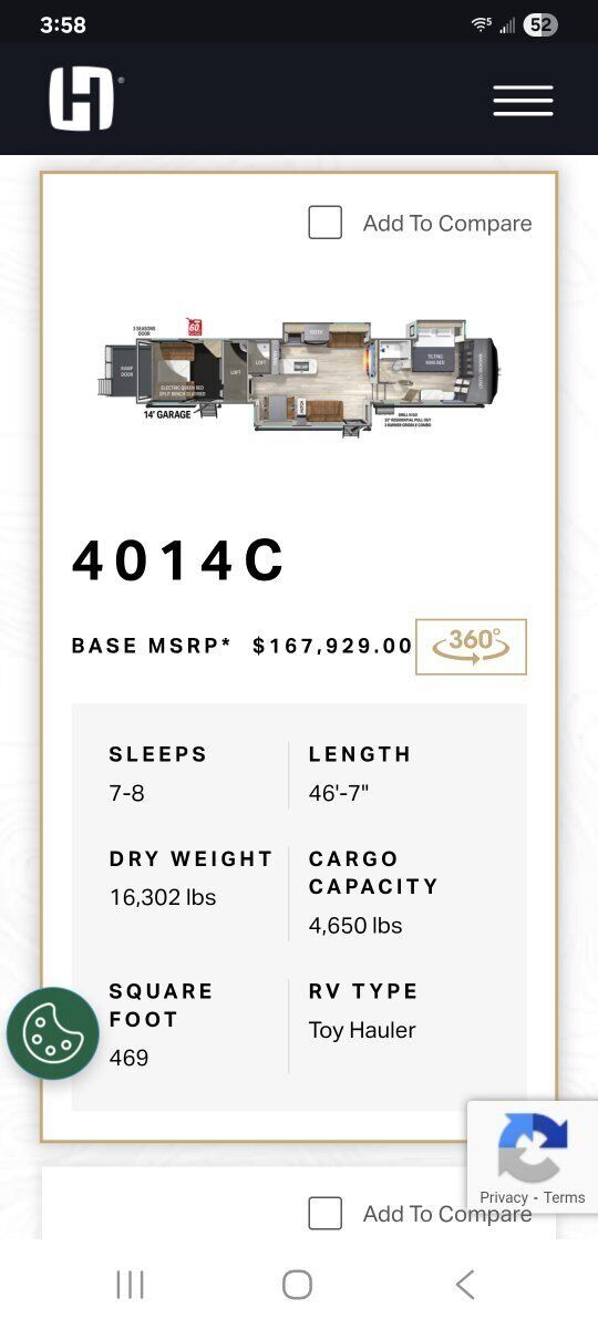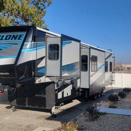 The 2025 Cyclone 4014C is a fifth-wheel toy hauler with luxury features and a king bedroom suite. It has a 150 gallon fresh water tank, 30% more basement storage, and a pull-out dresser workstation. Here's a summary of its key specs: Sleeps: 7 Length: 559" Dry weight: 16,302 lbs Cargo weight: 4,650 lbs Fresh water: 150 gallons Black/grey water: 80 gallons each Refrigerator: 12V, 20" Cooktop: 3 burners Awnings: 3 Washer/dryer: Available TV: 50" LCD HDTV Only used 2 times Party deck with 3 season sliding door Side and back up cameras Full bathroom in garage This trailer has it all