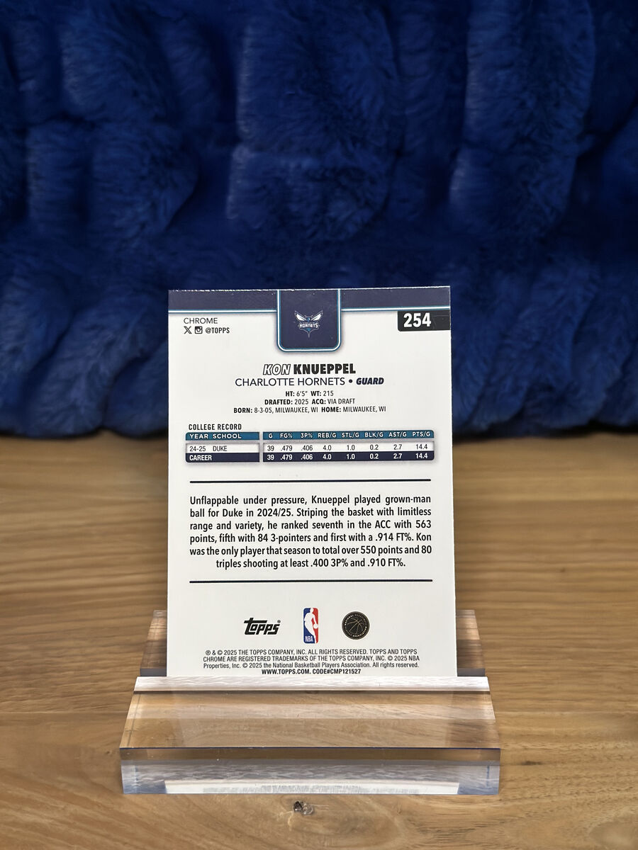 PayPalThe 2025-26 Topps Chrome Kon Knueppel #254 Purple Raywave Refractor /75 (RC) trading card is a highly collectible item for basketball fans and card enthusiasts. Priced fairly at below average of recent sales. Featuring a rare parallel variety with a limited print run of only 75, this card showcases the rookie player Kon Knueppel from the Charlotte Hornets in the National Basketball Association (NBA). Manufactured by Topps, the card is made of durable card stock and comes in near mint or better condition. With its unique design and serial numbering, this card is a valuable addition to any sports trading card collection.