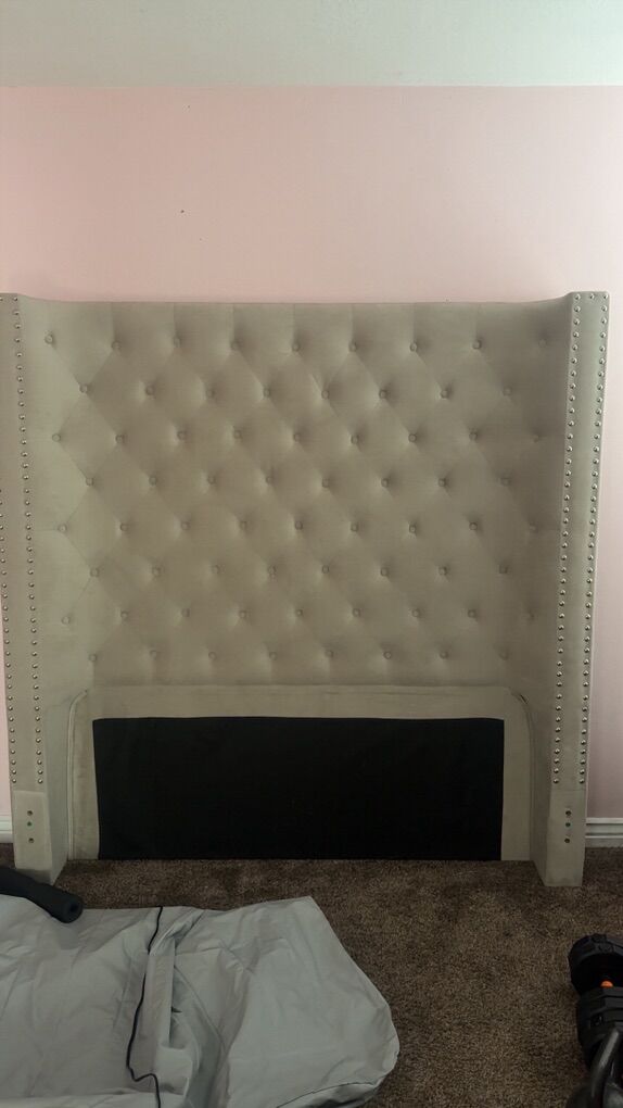 Light gray upholstered bed frame with a tall tufted headboard and silver stud detailing on the sides. Really good quality and sturdy. Has some minor wear from normal use but no major damage. Fits: queen Mattress not included. Pickup only.