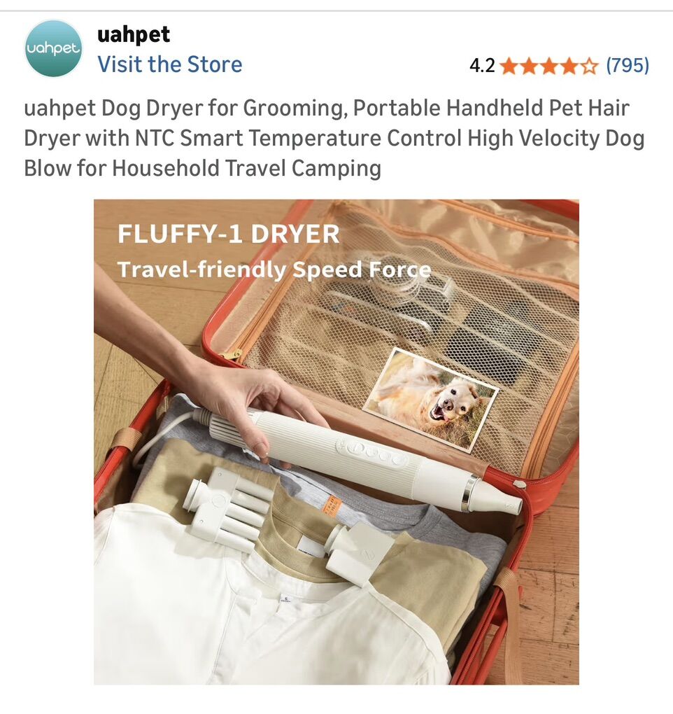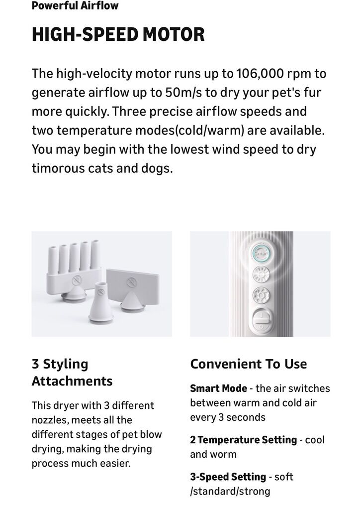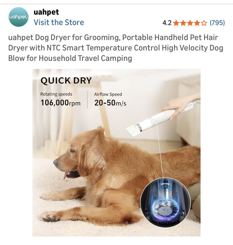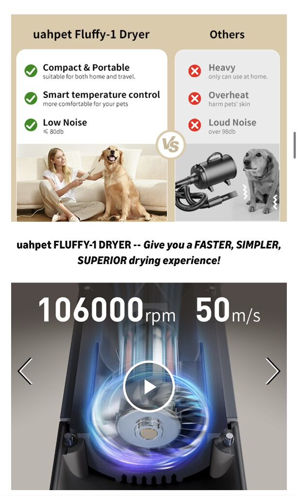 uahpet Fluffy-1 High-Velocity Portable Dryer The Powerhouse: Features a high-speed motor (106,000 RPM) to blast water away from thick or double coats quickly. Smart Tech: NTC Temperature control alternates air to prevent overheating and keep your pet safe. Quiet: Much more gentle than a standard human hair dryer. Travel-Ready: Lightweight and compact design.