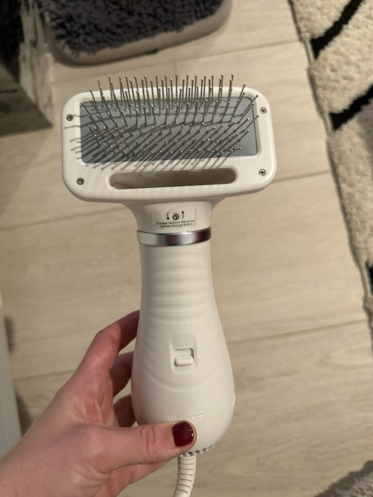 Pet Life Aero-Groom 2-in-1 Dryer & Pin Brush The Finisher: Brushes and dries simultaneously to leave the coat fluffy and smooth. Gentle Grooming: Air-pocketed pin brush is easy on the skin and follicles. Safe Heating: Dual intensity levels with built-in overheating protection. Convenience: Long 6.6-foot cord for easy movement.
