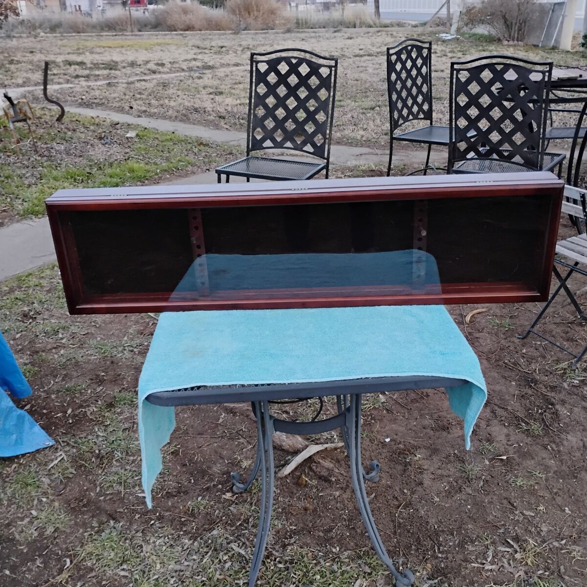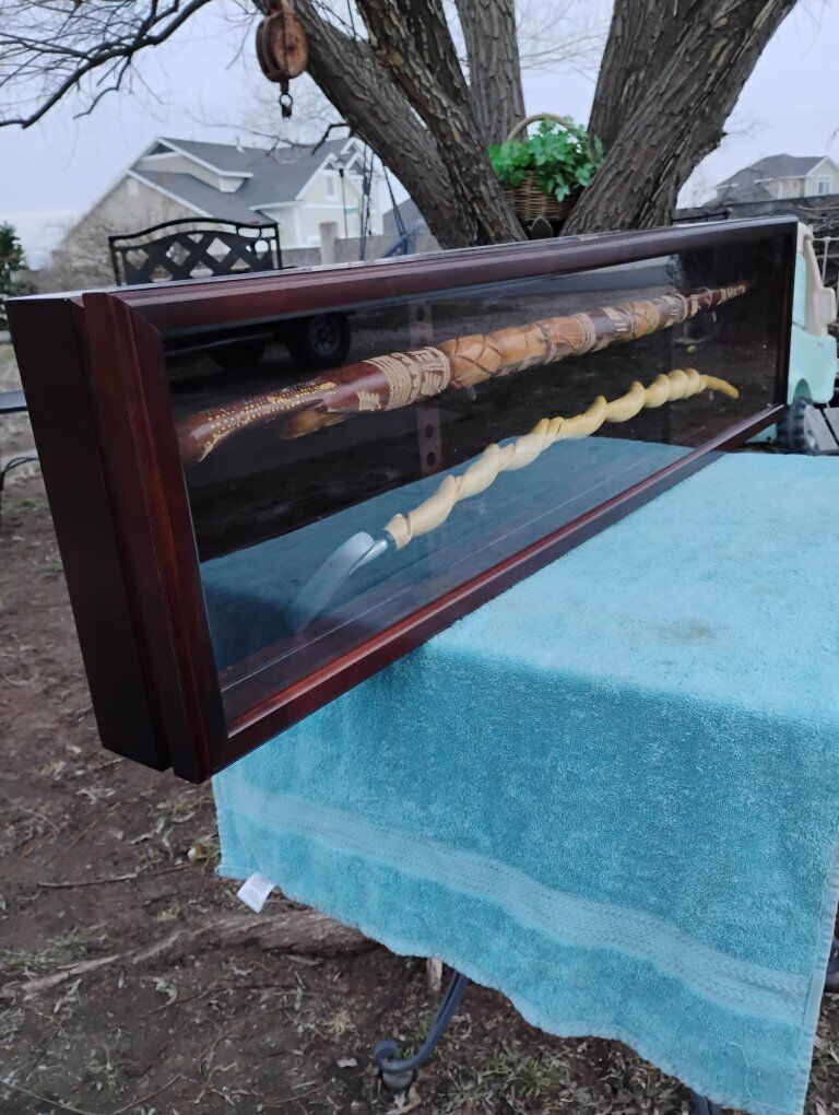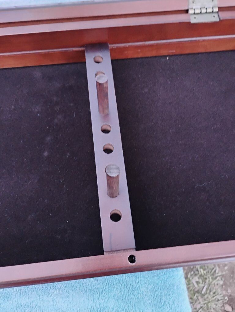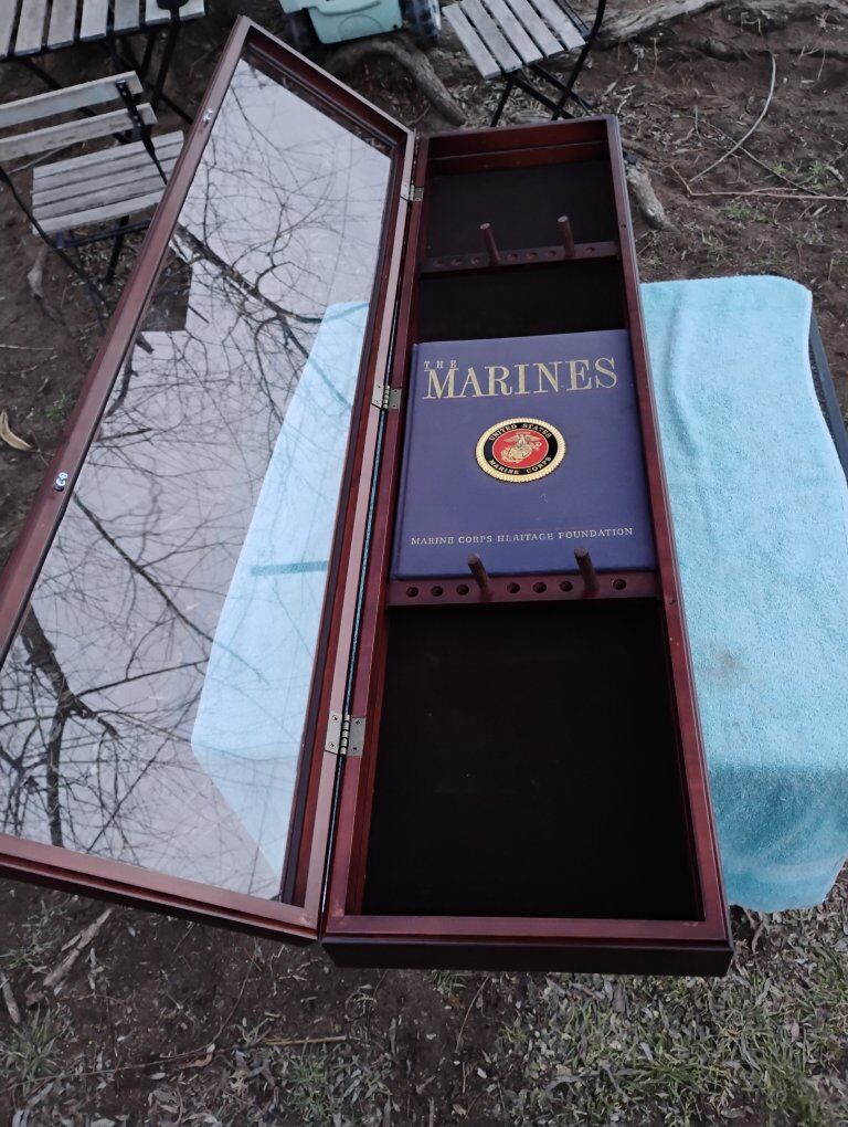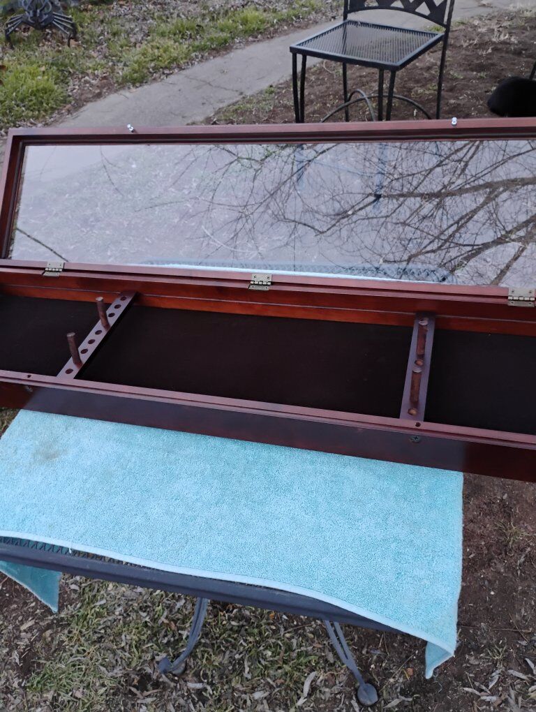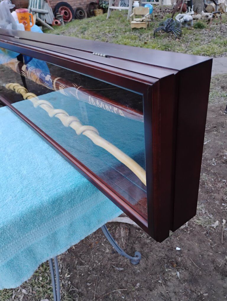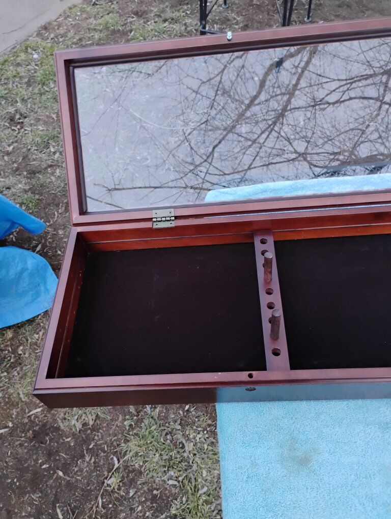 VenmoBeautiful Display/Shadow box. Cherry Wood Made in USA. By Sparta Craft Inc. They make case's for memorial flags. Quality build, adjustable pegs inside. Lined in brown velvet. great for golf clubs, swords, rifles, or whatever. mounting bracket included. could be set up vertical. See all pics. Size outside 48x12x4.25 deep. inside, 46.5x10.5x3.25 deep. Very nice cabinet. Items in pics not included.