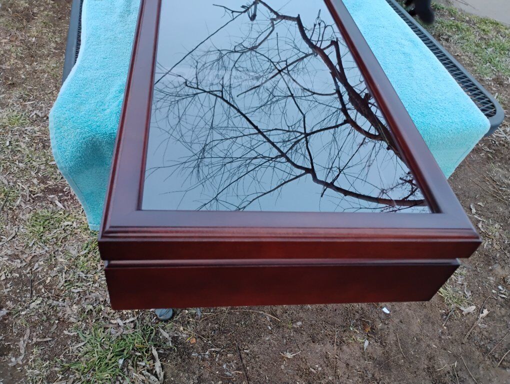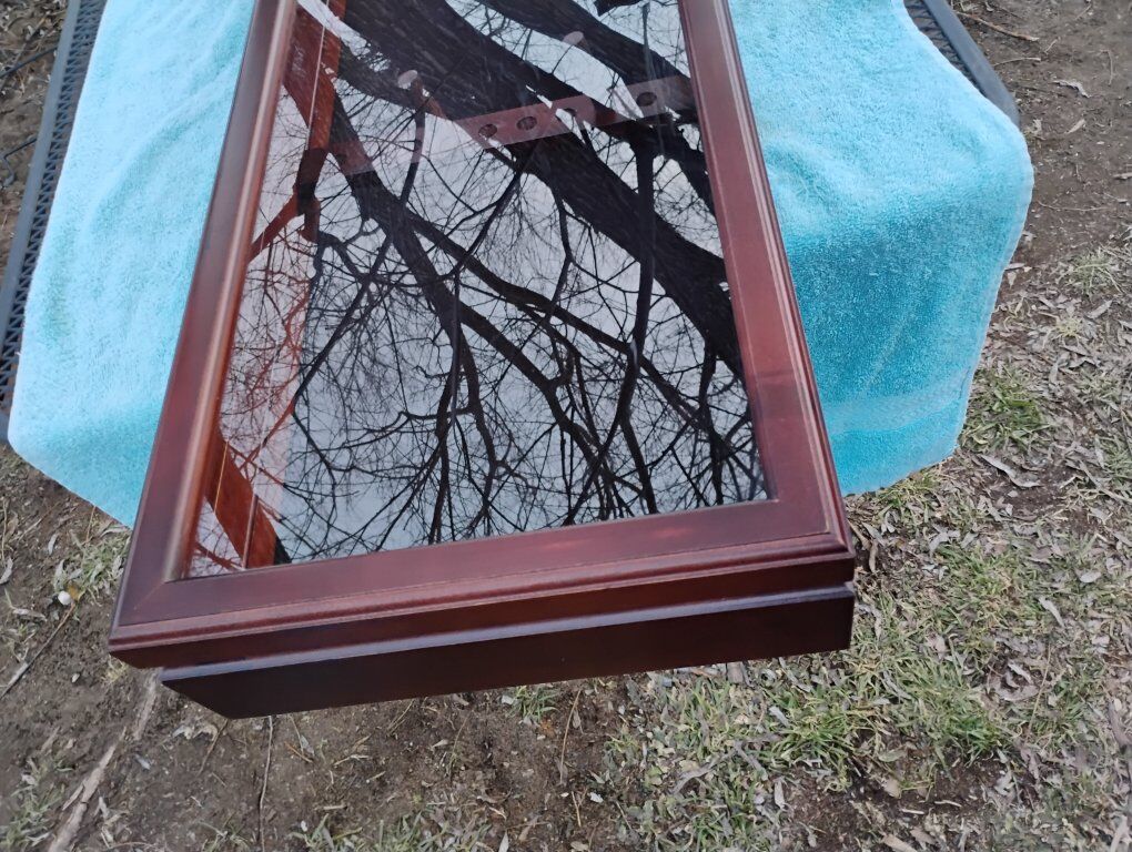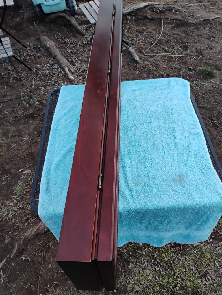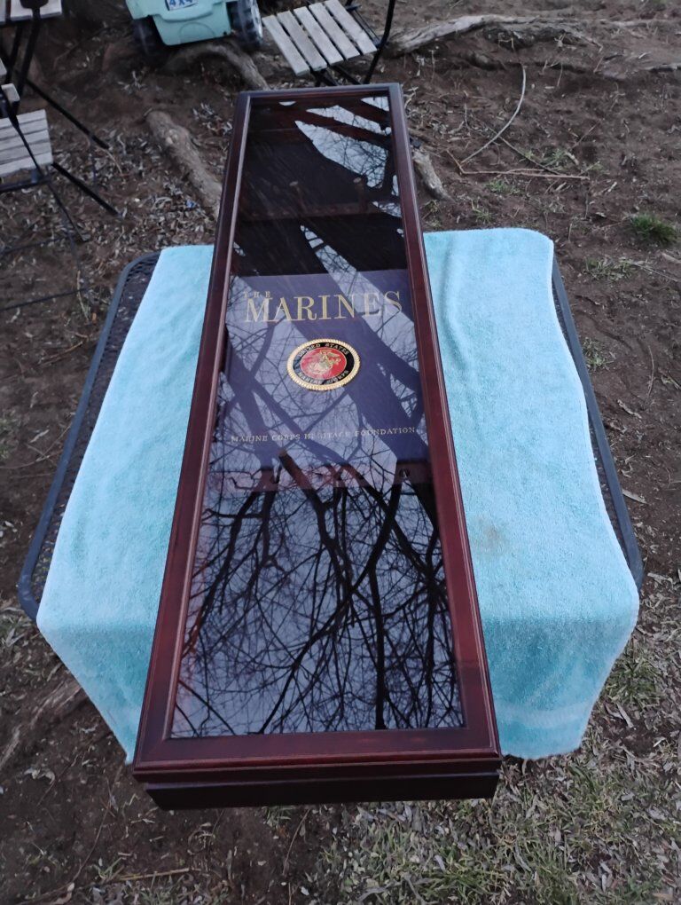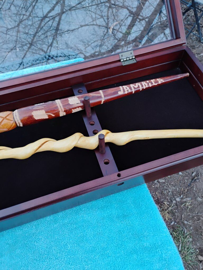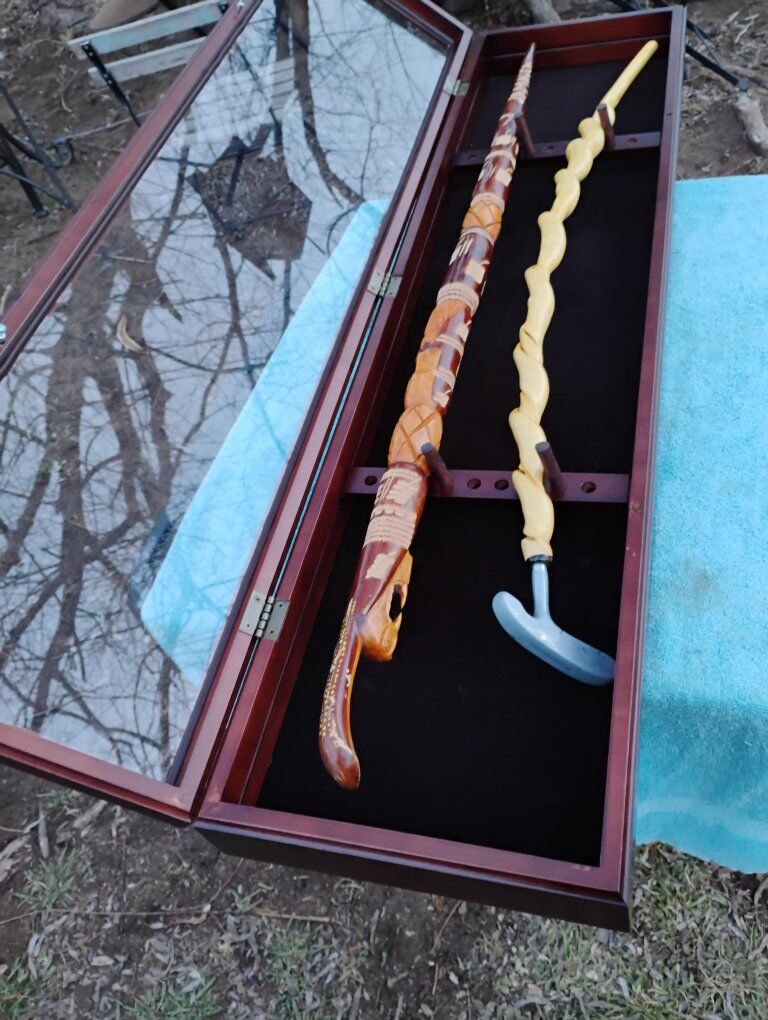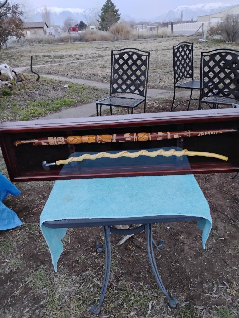 VenmoBeautiful Display/Shadow box. Cherry Wood Made in USA. By Sparta Craft Inc. They make case's for memorial flags. Quality build, adjustable pegs inside. Lined in brown velvet. great for golf clubs, swords, rifles, or whatever. mounting bracket included. could be set up vertical. See all pics. Size outside 48x12x4.25 deep. inside, 46.5x10.5x3.25 deep. Very nice cabinet. Items in pics not included.
