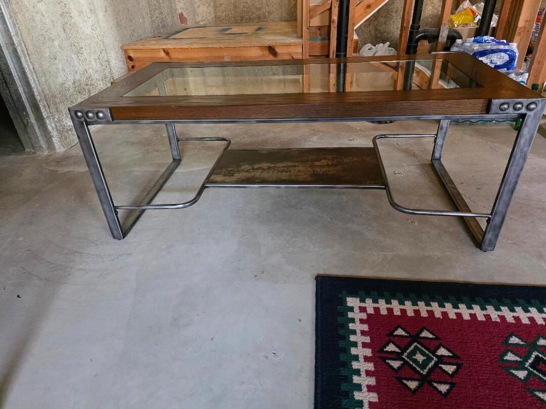 CashAppQuality living/family room table set consists of 1 coffee table (18" T x 48" W x 23" D) and 2 end tables (both 24" T x 24" W x 23" D). Designer metal frame with rustic metal magazine shelf below. Stylish wood trim with glass table top. Excellent condition. Selling as a set. Text or call Marina 801 989 0242