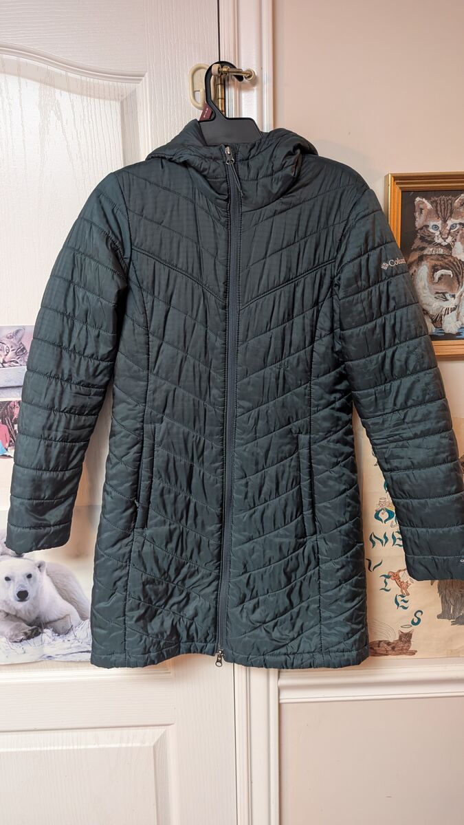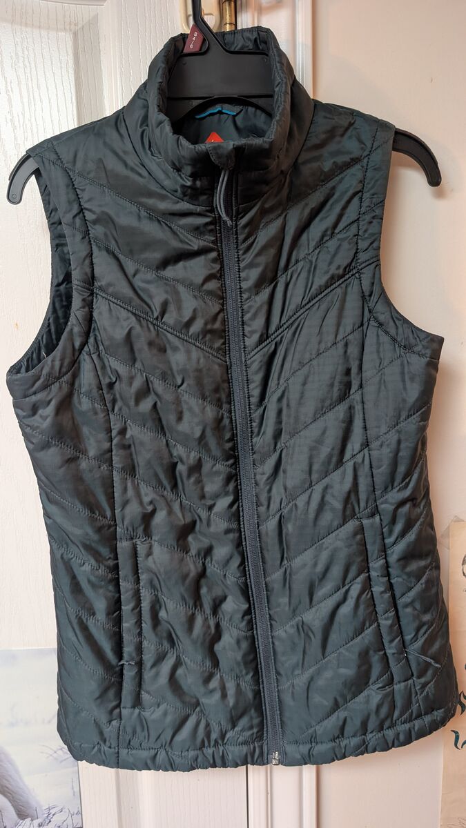 PayPalUnique color mid-length Columbia Women's thermal jacket with hood, thumb holes, zippered pockets. Vest bought at same time and matches, allowing venting if one chooses to wear together with jacket unzipped. Vest can also be worn separately. A much-beloved piece that no longer fits and is in good condition. One small imperfection repaired is about 1/2" and shown in final pic. Would also consider selling jacket separately for $40 and vest for $10.