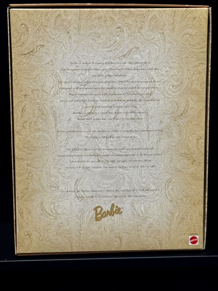 *1998 Special Edition Holiday Barbie *1994 Classic Ballet Series Marzipan In The Nutcracker *1998 Collector Edition Silken Flame Barbie *1994 Collector Edition Victorian Barbie with Cedric Bear *1998 Limited Edition Collectible/Specialty Golden Anniversary Barbie Created Exclusively for Toys ‘R’ Us to commemorate their 50th Anniversary Children Affected By Aids Foundation