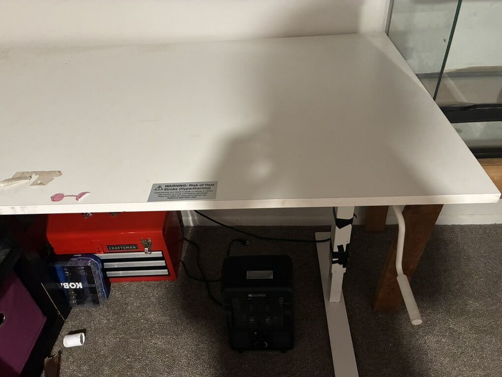 Standing desk. 61 inches side to side. 31 inches front to back. Can lower and raise.