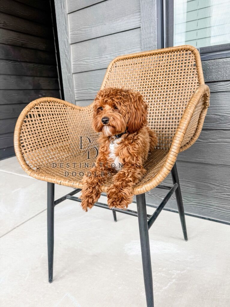 This little guy is the total package. Little Caesar is a 5lb multigen Goldendoodle with a rare straight coat, making grooming much easier than with traditional curly doodle coats. He’s 100% genetically clear (no IVDD or CDPA!!), fully furnished, and carries for parti, producing gorgeous puppies with beautiful white markings. He’s been getting lots of second dates as people have been thrilled with the puppies he produces.