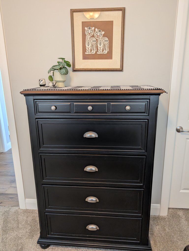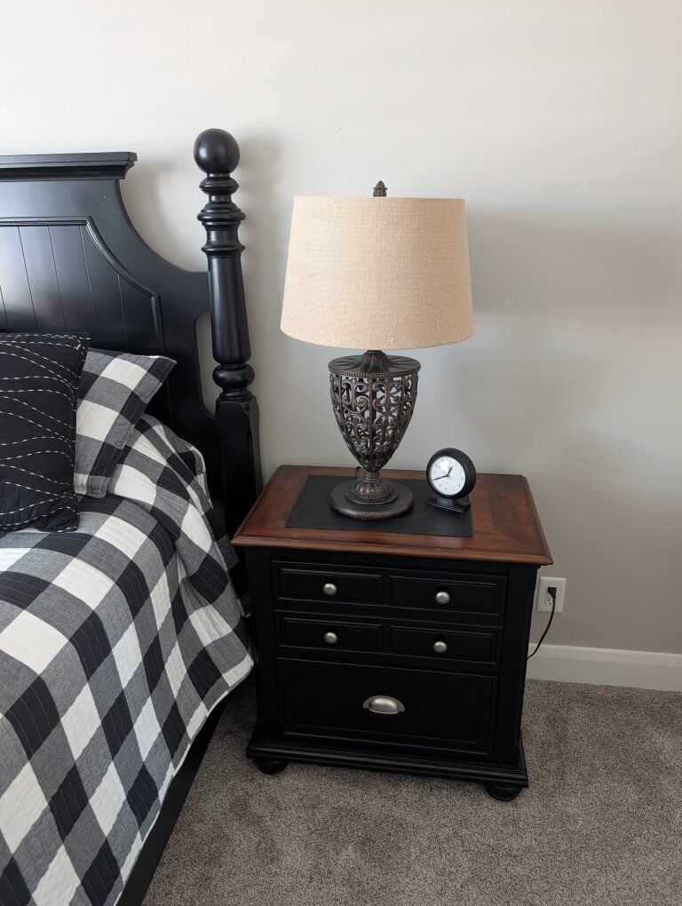 Queen size headboard and footboard with wooden rails. Beautiful 5 drawer chest and nite stand. Excellent condition. No mattress or box springs.