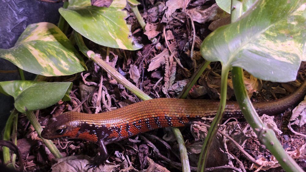 PayPalSelling our 3-skink setup in a 40-gallon breeder tank. Has live colony of isopods thriving in there as well (probably the occasional snack too!). Pathos has done very well and dead leaves provide additional feed for isopods. Skinks eating well on a mixture of crickets and roaches.