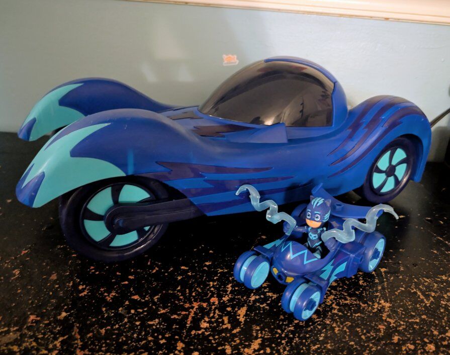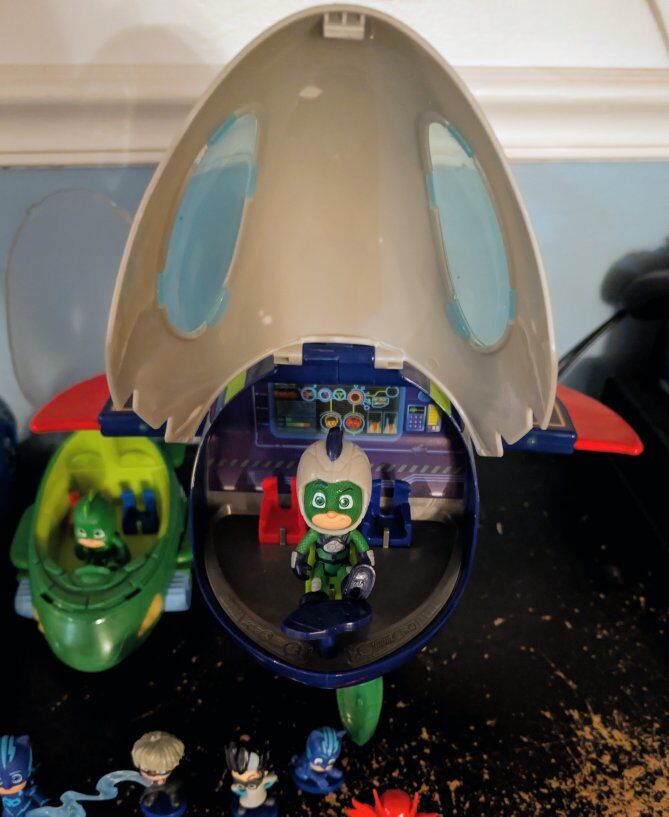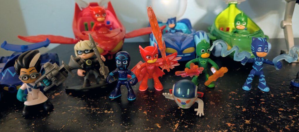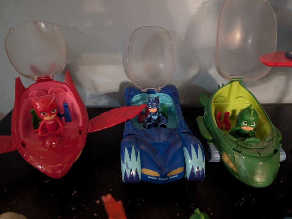 CashAppAll working, sanitized and tested, like new. 3 vehicles with each character that sing and headlights glow. Mask air jet that sings and lights up, when the button is pushed the wings let out. Large ship with Gecko that also sing and lights blink, has seats for all the characters and the bottom comes down with Geckos bike to sit in. Big and small vehicle of Cat Boy. And more characters and villains with weapons that fit in their hands. 15 characters total. So cute and so much fun to play with! $55 obo Message or text 385-301-6444