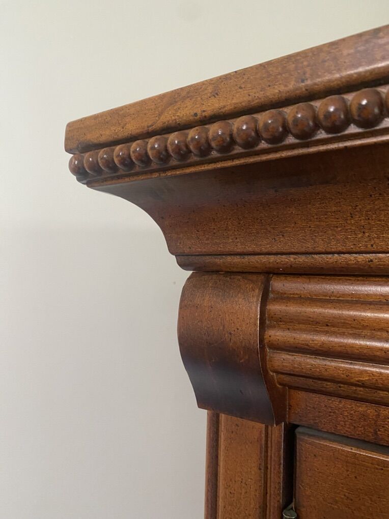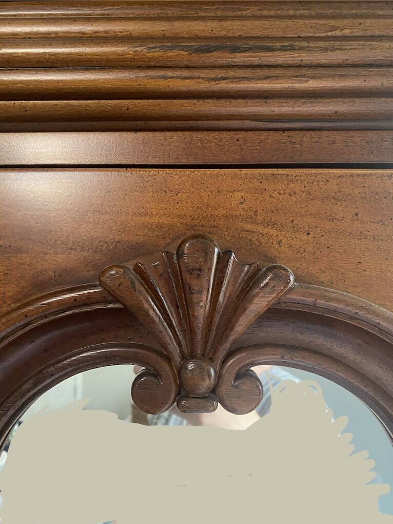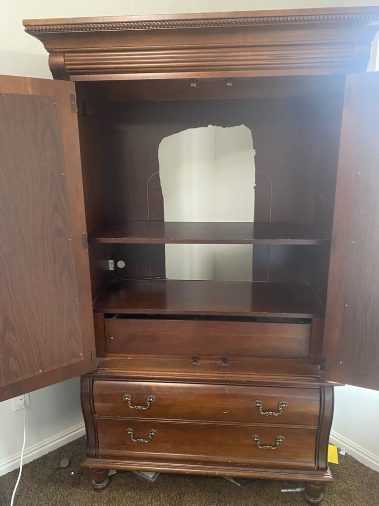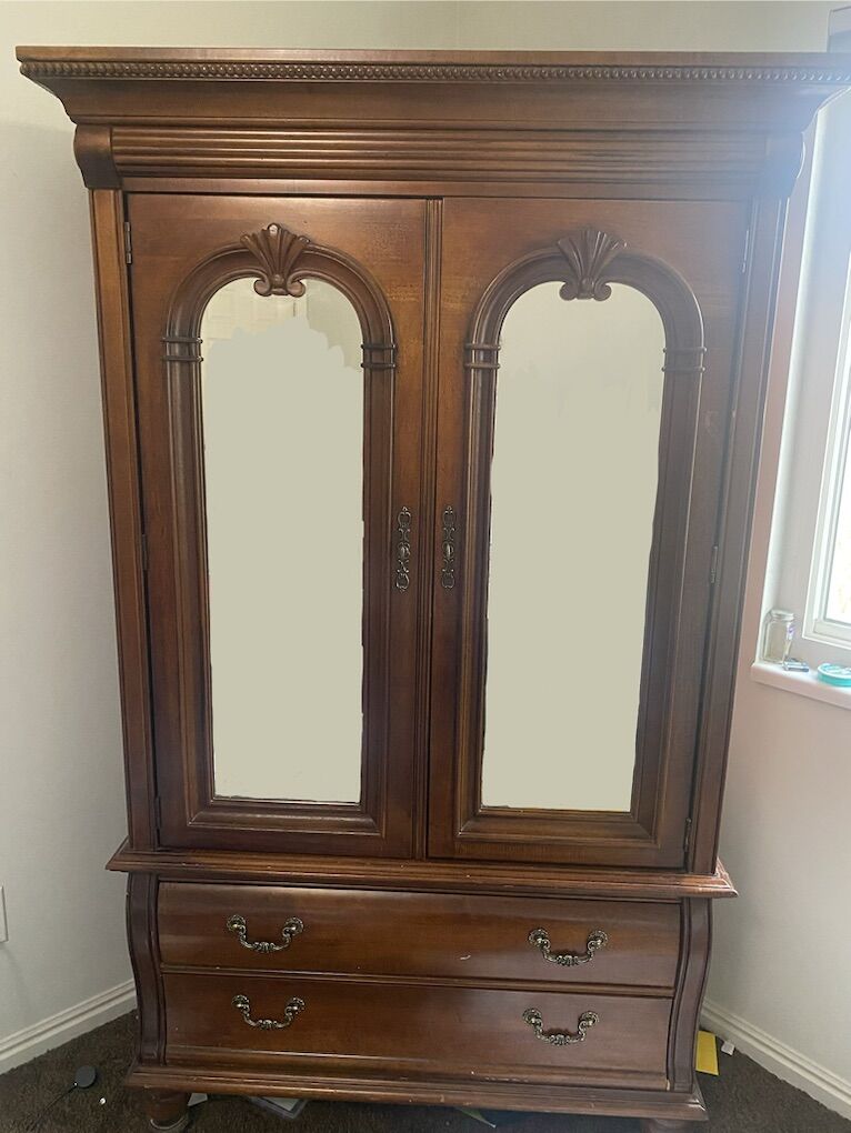 VenmoMahogany finish mirror door armoire with soul drawers and hidden inner drawer. 74” H, 44”W, 20.5” D including crown molding. Must take away, I can’t deliver it.