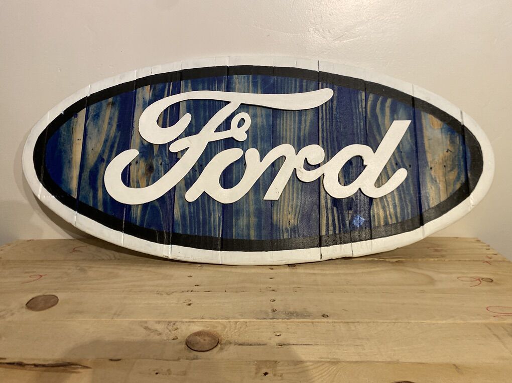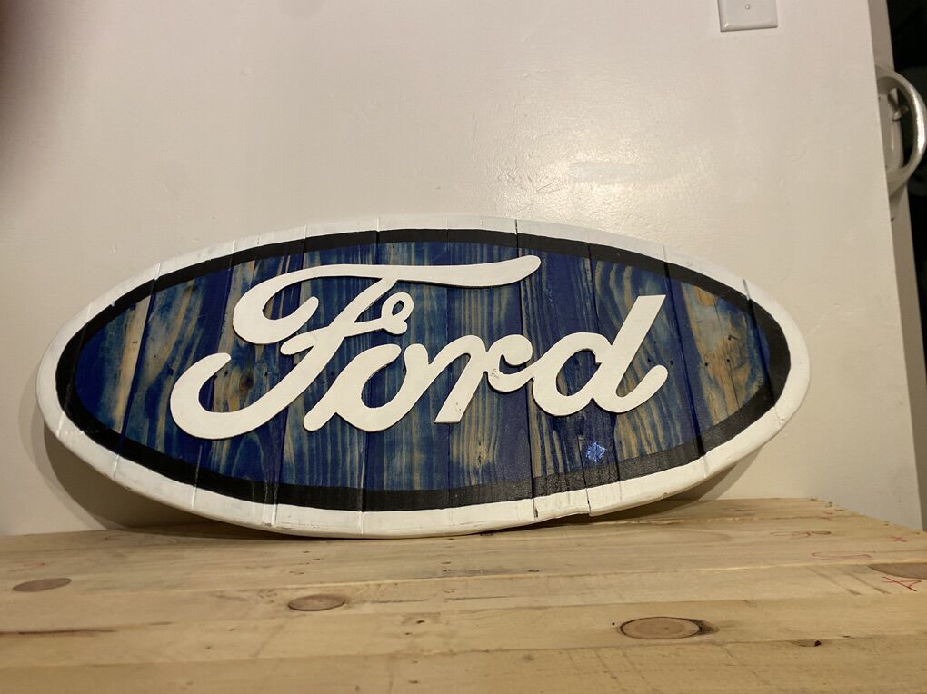 FORD LOGO CUSTOM painted cut from wood ford was cut from aluminum and painted sanded and clear coated for protection..16x35 inches