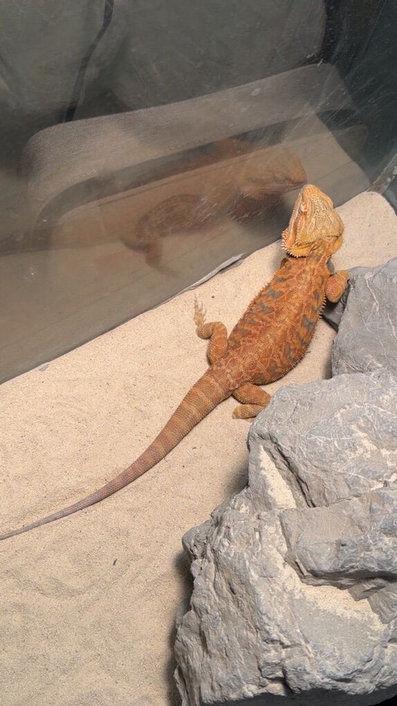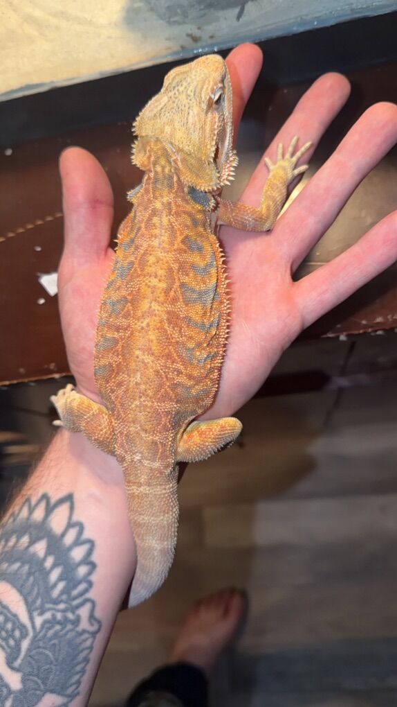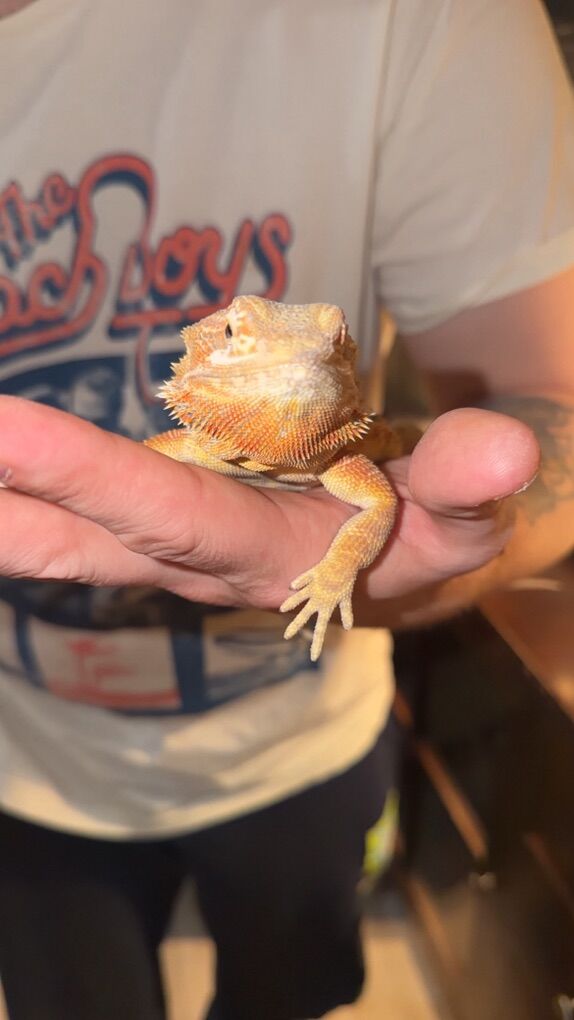 CashAppOrange female bearded dragon she is under 1 year old. I don’t have the time to take care of her. She’s really good with kids and likes to be held. Comes with tank and lights.