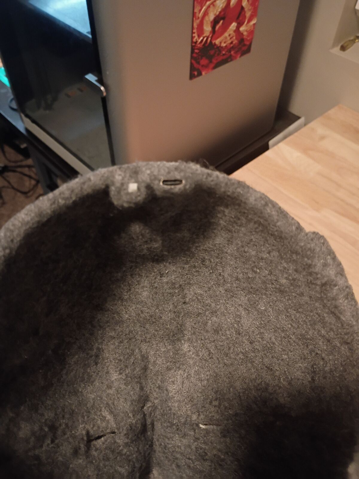 The helmet is 3D printed, carefully assembled, and detailed with intentional weathering to give it an industrial, battle-worn aesthetic. The interior is lined with gray cotton fabric padding for improved comfort and stability when worn.