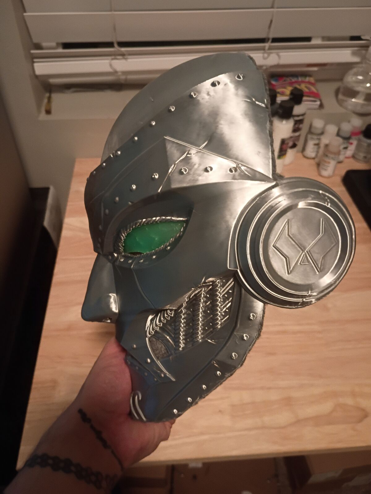 This is a one-of-a-kind, handmade sci-fi helmet created using silver silk PLA and finished by hand for a realistic metallic look. Designed as a display-quality prop or cosplay piece, this helmet features bright green LED eyes powered by a rechargeable internal battery.