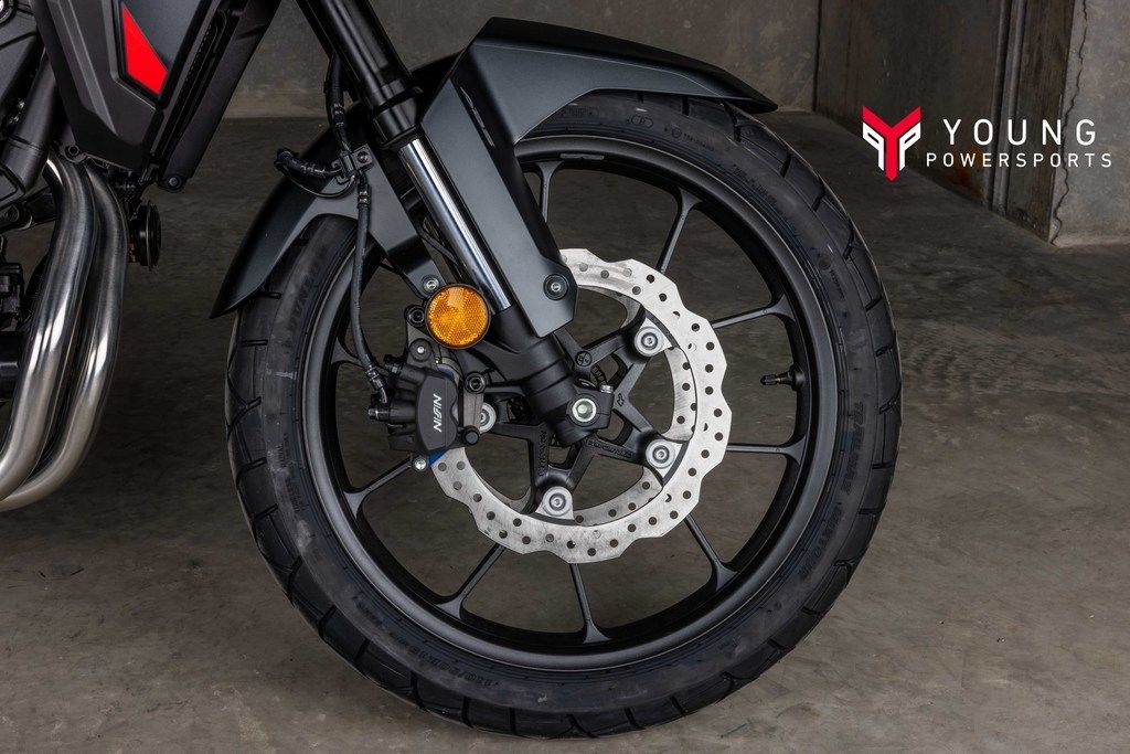 2025 Honda® NX500Unleash your inner explorerAnywhere can be your escape. The NX500 brings rugged ADV styling and an upright riding position, ready for whatever journey you desire. And with all-around performance at a price that’s easy on your wallet, adventure is closer than you think. Just pick your route and ride.Features may include:DOHC twin-cylinder engineThe 471cc liquid-cooled parallel-twin engine provides smooth, usable power across the rev range, enabling this mid-sized adventure motorcycle to achieve the optimal balance of performance and agility.Inverted forkSeparate Function Fork—Big Piston (SFF-BP) front end enhances rigidity and features a lengthy 5.9 inches of travel. This increases off-road capabilities and provides more precise on-road steering input and feel. Adventure stylingLike its adventure abilities, this bike gets the ADV look just right – sleek, stylish, and no-nonsense. Additionally, the upright seating position allows for freedom of movement.Tall windscreenA tall windscreen is designed to provide excellent protection from the elements and enhance the rugged adventure appearance.Anti-Lock Braking System (ABS)Our Anti-lock Braking System (ABS) comes standard, allowing you to make smoother and more controlled stops even in unfavorable riding conditions like rain and gravel.Passenger handholdsSturdy passenger handholds offer security for your passengers or can be used as tie-down points for cargo items.Digital instrumentationAn easy-to-read Thin Film Transistor instrument display includes a digital speedometer, tachometer, odometer, trip and fuel meters, and more.
