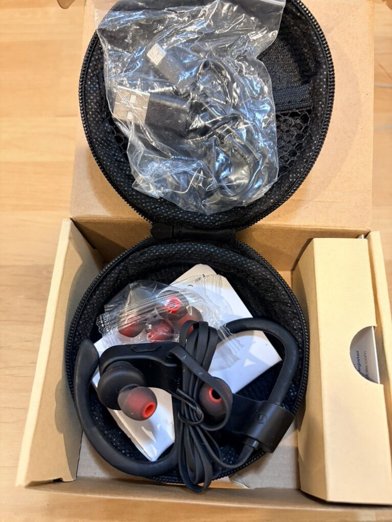 Optimum still on Amazon. Neckband. Comes with case, charging cord and extra ear pieces.