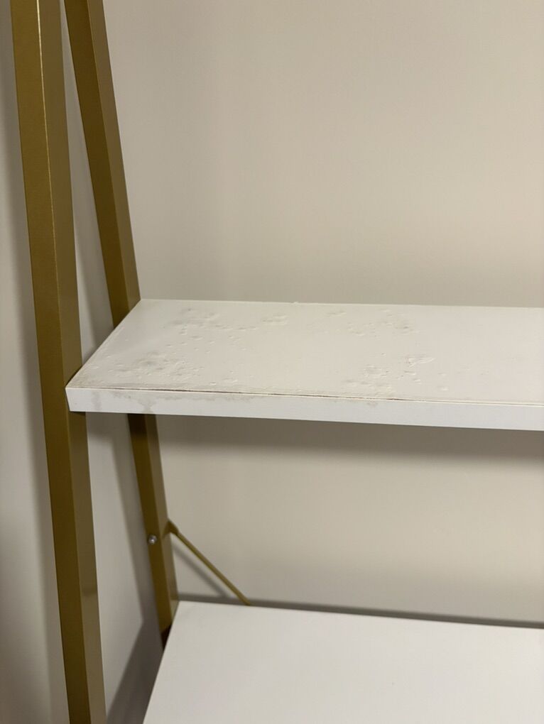 Zelle5 tier bookshelf it has barely been used but it does have a bit of water damage on the top shelf that is shown in the second picture. Besides that it’s in perfect condition.