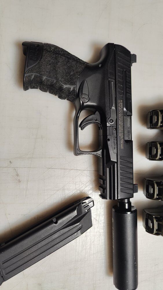 GooglePayElite Force PPQ Green Gas pistol with maple leaf bucking and barrel with UV tracer unit attachment and 5 magazines and 4 belt holsters. The grip has custom stippling done. This has been a beast of a pistol. Asking $220