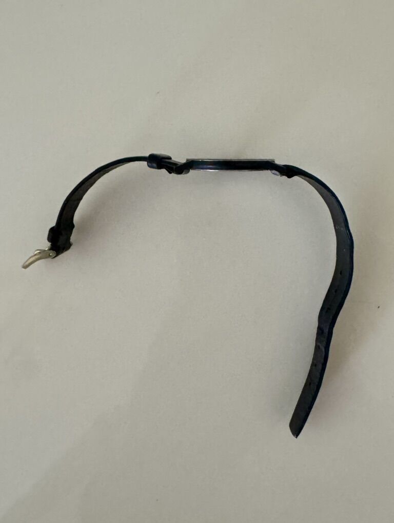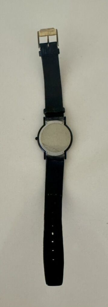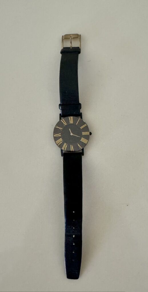 VenmoClassic, men’s Movado watch, very thin and lightweight. Works great. Black with gold face numerals, and black strap.