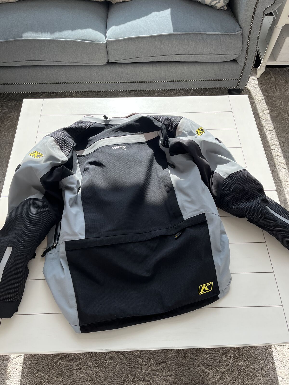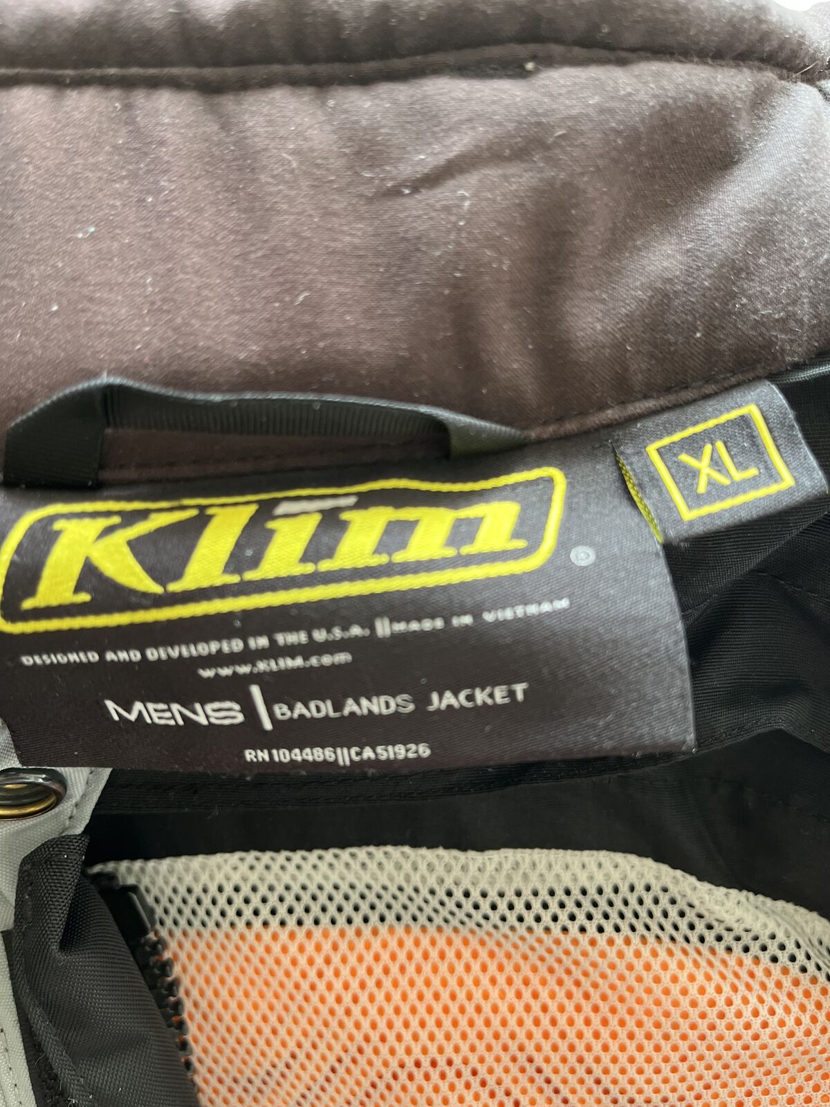 KLIM Badlands motorcycle jacket. Jacket is in really good condition with normal wear, no rips or damage. All zippers and closures work as they should. Great adventure/touring jacket, Gore-Tex, D30 Armor, very durable and weatherproof. Size XL