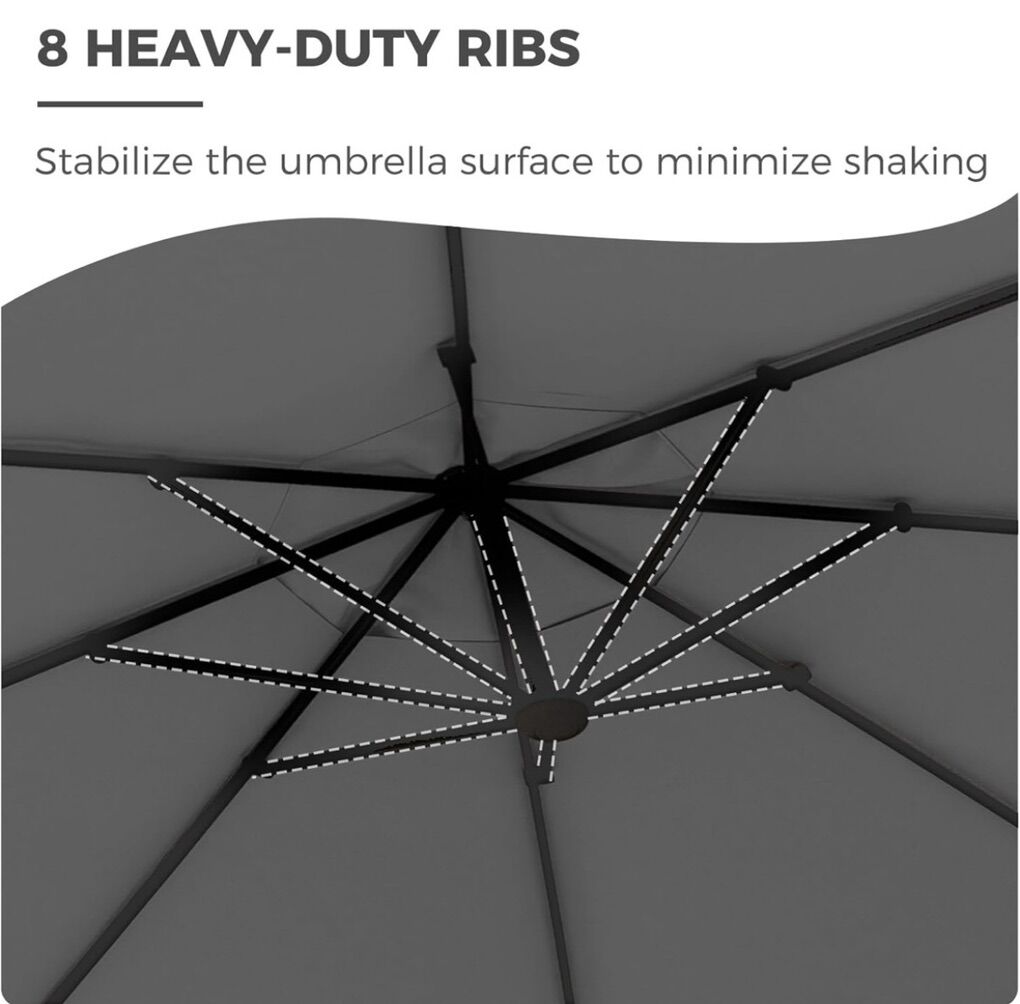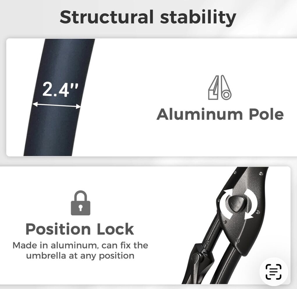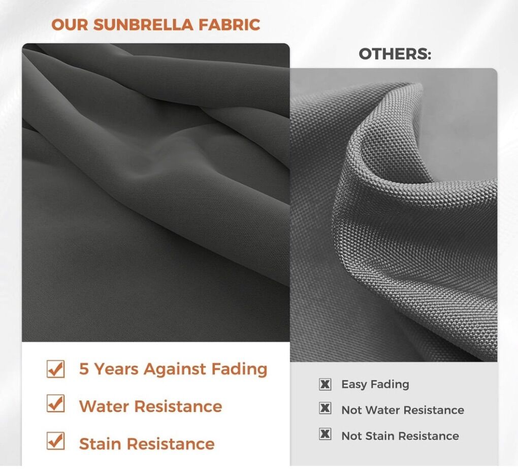 SUNBRELLA FABRIC: Premium quality umbrella canopy made from industry-leading Sunbrella fabric, 270-gram breathable outdoor fabric, 100% solution-dyed acrylic, 5 years fade-resistance, water and stain resistance, added sun protection against skin damage EASY TO OPERATE: This large outdoor cantilever umbrella features an ergonomic crank for smooth opening and closing. The auto-lock system allows angle adjustments for optimal shade. For safety, close the umbrella into the deadlock position when not in use UNRIVALED PROTECTION AND ENDLESS SHADE: Seamlessly connect multiple umbrellas for effortless space utilization, making it the essential companion for large memorable gatherings idyllic picnics, joyful parties, and tranquil poolside WEIGHTED BASE INCLUDED: The base features integrated wheels for easy movement and steel reinforcement with hidden levelers for added stability. Fill with 330 lbs of sand and 44 lbs of water (374 lbs total) for enhanced stability in breezy conditions STURDY AND STABLE: The 10FT patio offset umbrella features a 2.4 diameter aluminum pole and 8 reinforced steel ribs for superior strength and support. All frames are treated with industry-leading anti-corrosion for maximum rust protection