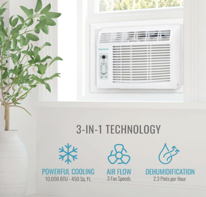 ZelleReliable Window AC Units: Our powerful 10,000 BTU window air conditioners are what you need to efficiently cool any small to medium sized room up to 450 Sq. Ft. Maximum Comfort: This window unit features 3 cooling modes, 3 fan speeds, 4-way adjustable air louvers and timer; Aside from cooling, 2.3 pints of moisture from the air is removed every hour with the built-in dehumidification system Washable Filter: The check filter indicator light will alert you when it is time to clean; Just slide the washable, reusable filter out of the window air conditioner with remote control and clean Smart Remote Control: The remote takes the temperature of the room you are in, displays it on the LCD screen and sends a signal to your window air conditioner unit every 3 minutes for accurate cooling Energy Saving Comfort: Our window ACs will give your electric bill a break by using the 'Energy Saver' or 'Sleep' mode that automatically lowers settings to use less energy