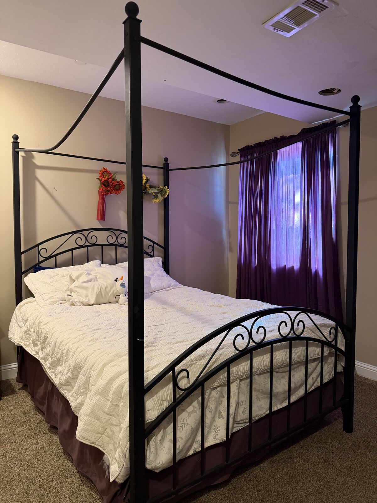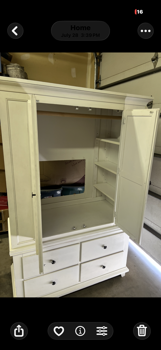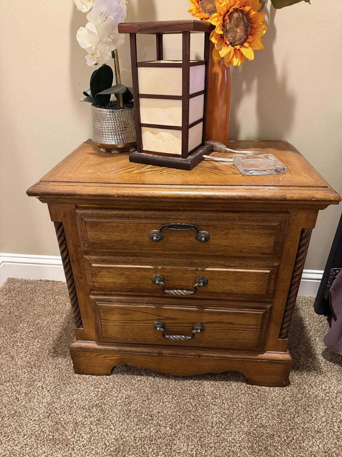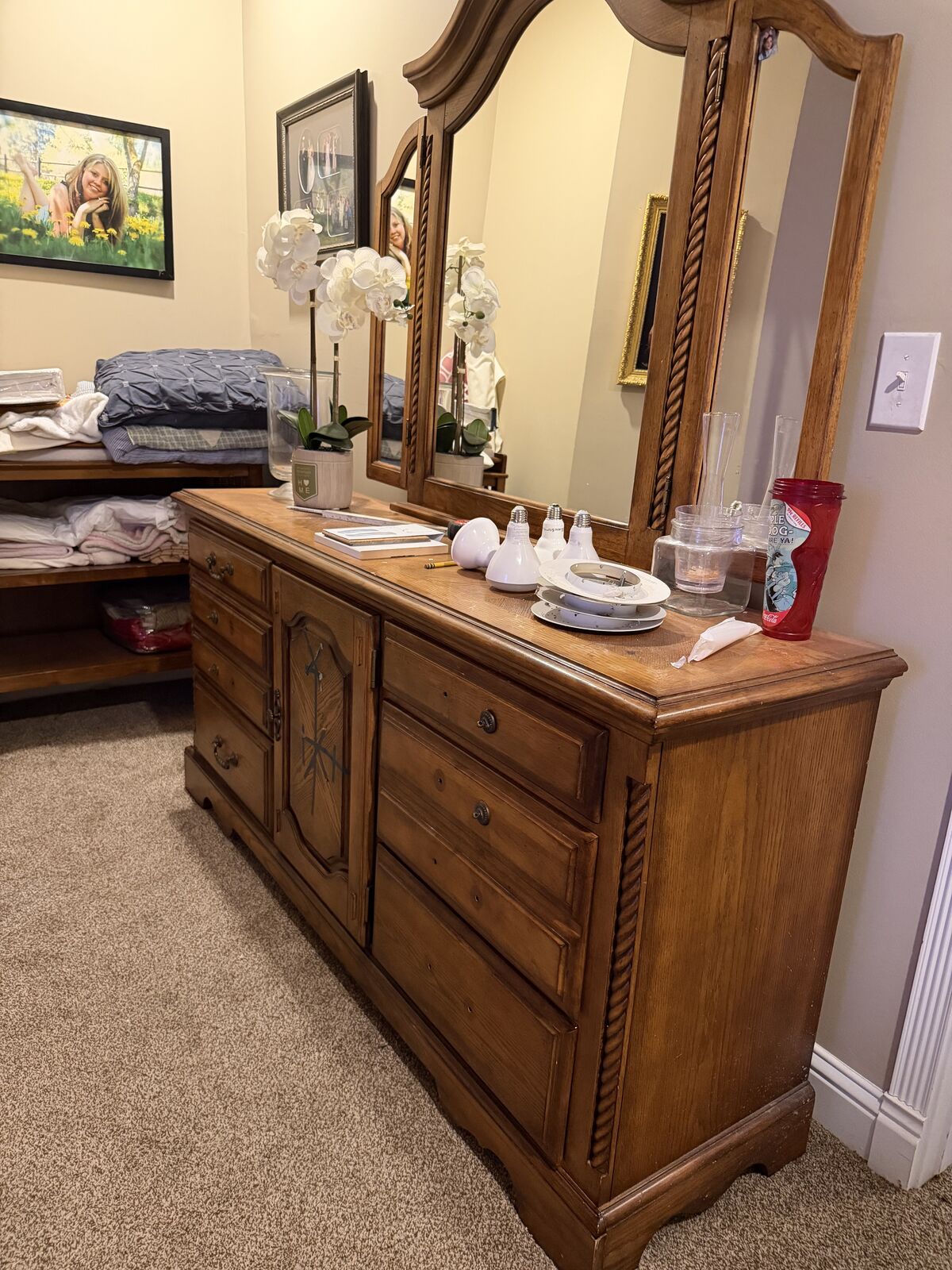 We are giving away a number of furniture items including a love seat, dresser with mirror and matching night stand, iron canopy bed with head and foot board, a corner oak desk with drawers and storage, a armoir hutch with drawers and matching toy chest.