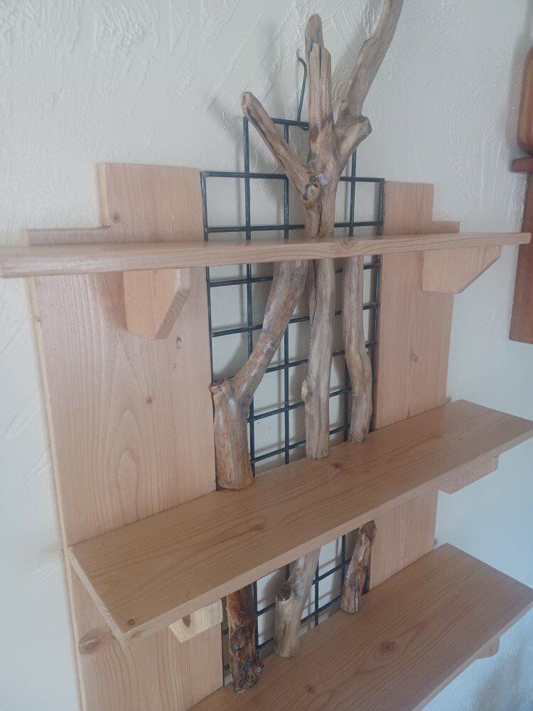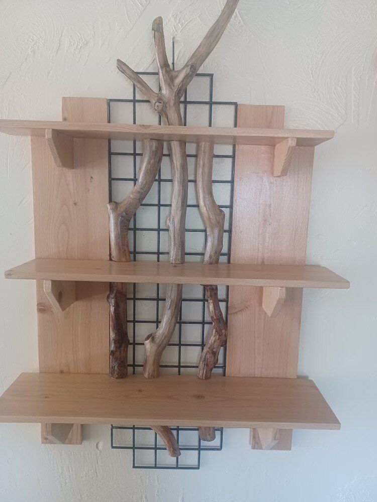 One of a kind shelving display unit. 33" H x 26" W x 8" D. Hand crafted by local artist.