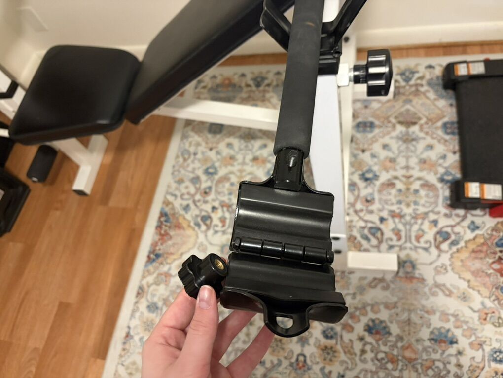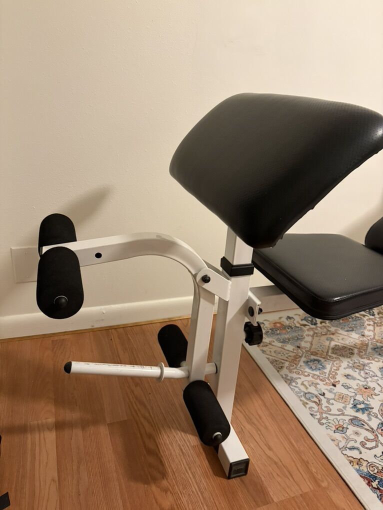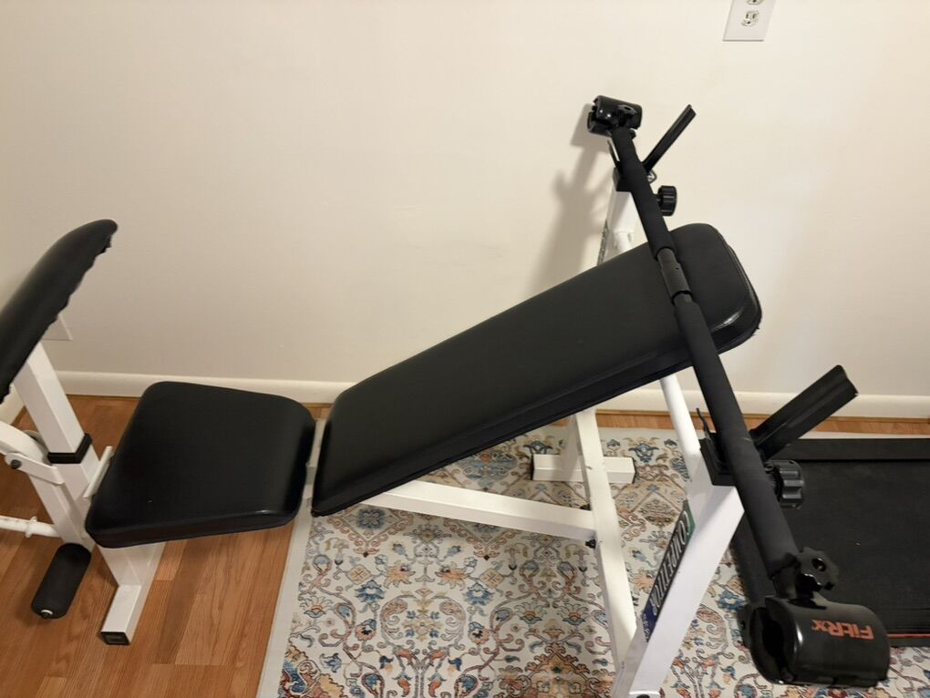 ApplePayAdjustable Lifting Bench with RxFit bar included. The bench has an abdomen workout attachment at the end which you can add weight to the bottom. We redid the wood in the ab part to make it more secure. The bar you can add any size dumbbell to adjust the weight.