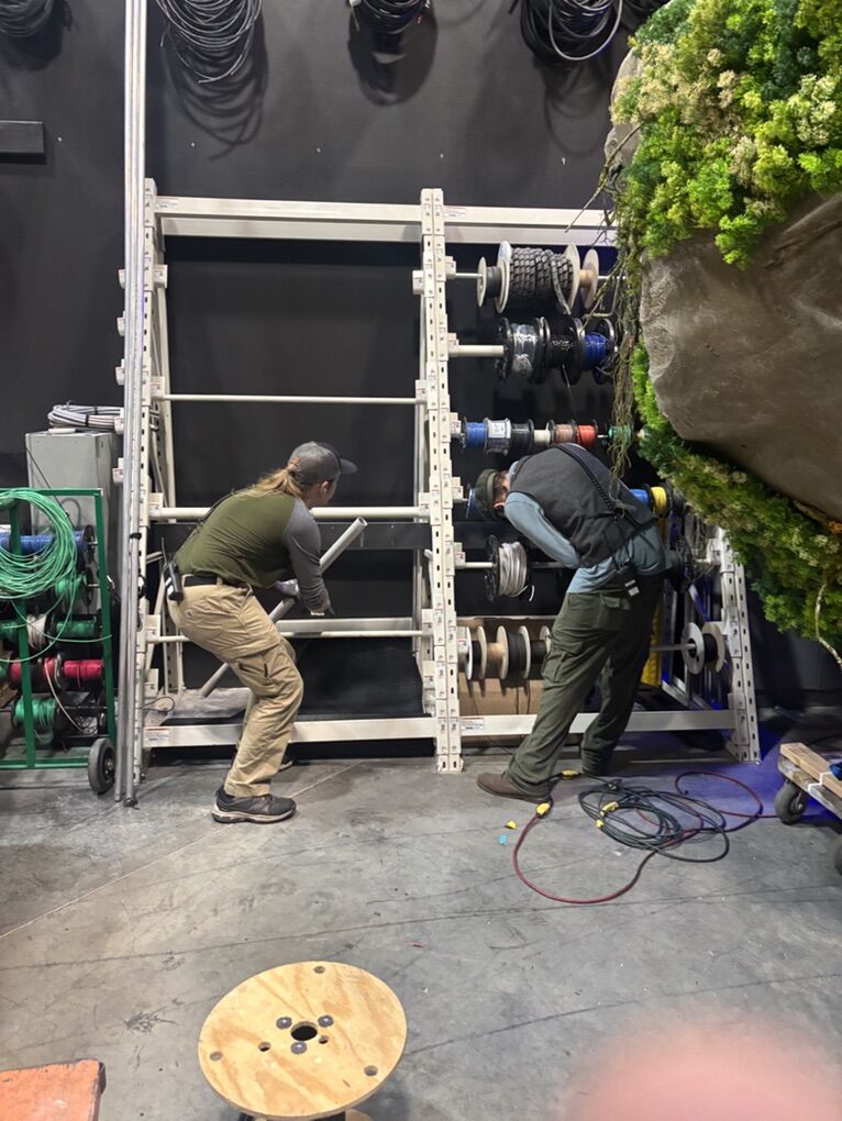 From Hale Theater we have a heavy metal storage rack for spools. Carpet, wire, cording or anything on a spool. This is in pieces with all its hardware for easy pick up. In Sandy at our shop. 8 ft 4 inches high 42 1/2 inches at base 110 inches wide
