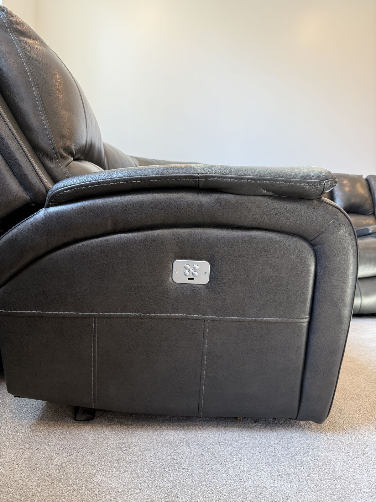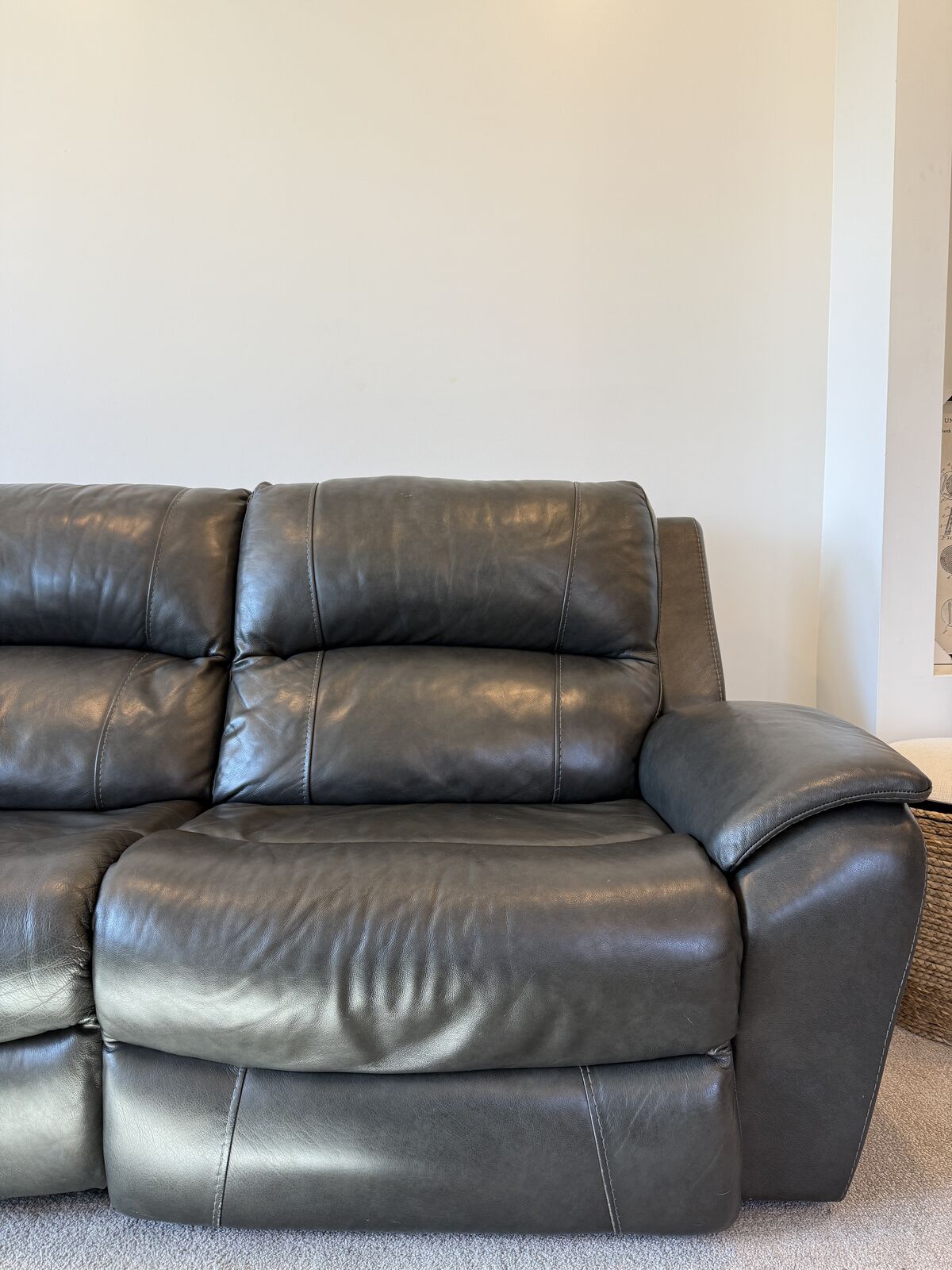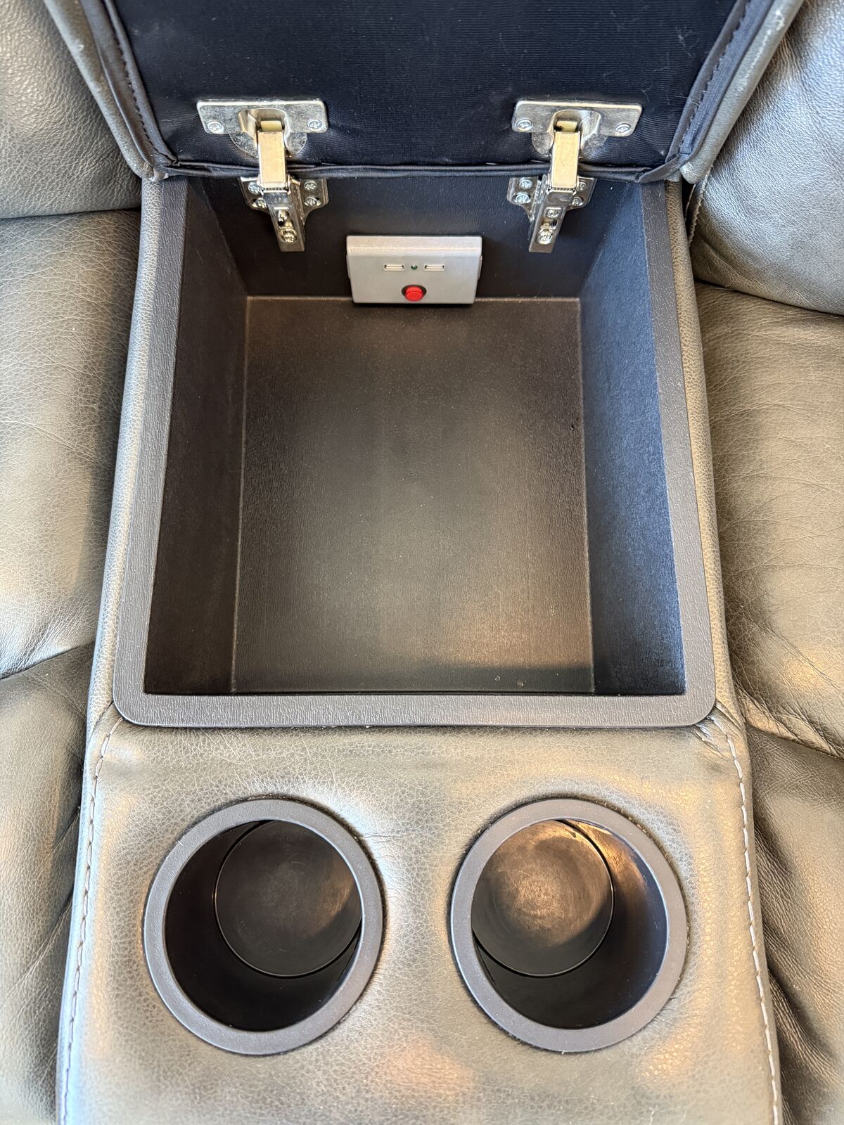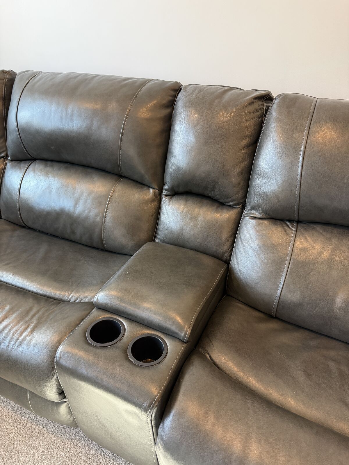 Venmo6 modular pieces including right and left arm recliner, armless recliner, armless non recliner, corner, and console. 5 years old, very good condition. No rips or tears in leather. side hooks for each piece to lock them together. Charging outlets in console. Daisy chain plugs for each piece so you only need 1 or 2 outlets depending on how you set it up. Right arm recliner foot rest sinks when fully extended because of kids sitting on it. All recliners recline and each recliner has its own charger.
