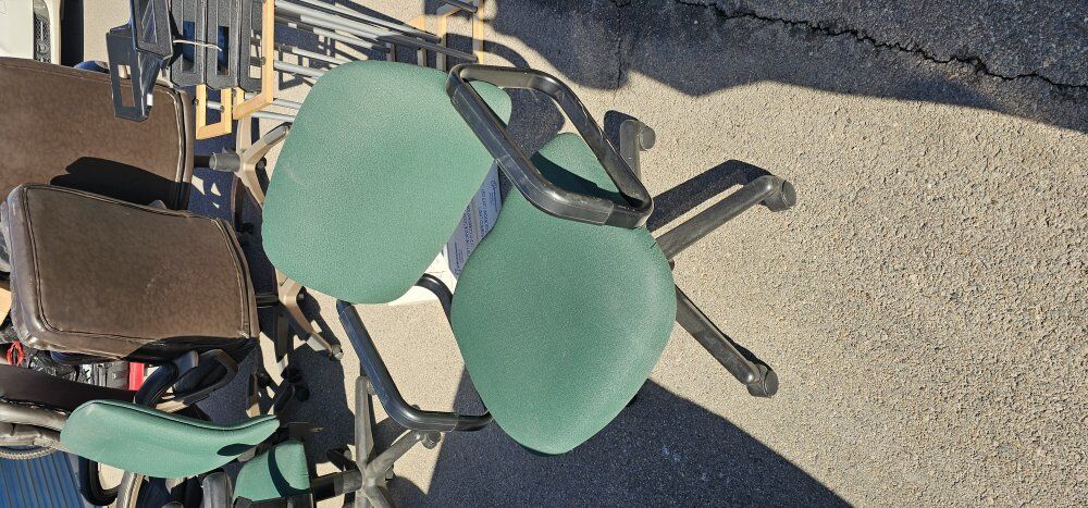 Venmofully functional cloth, green and black, rolling, office chairs with arms. 1 with arm rests, 7 with full arms.