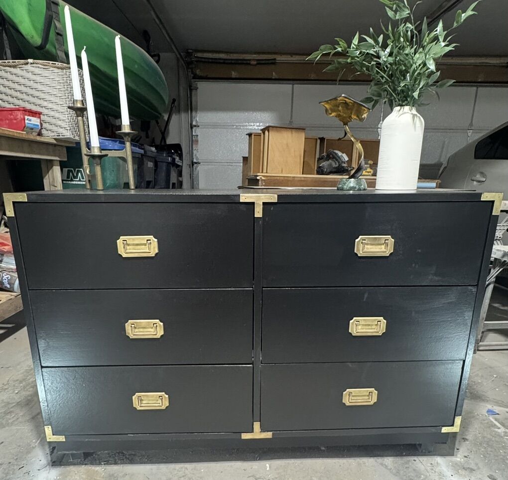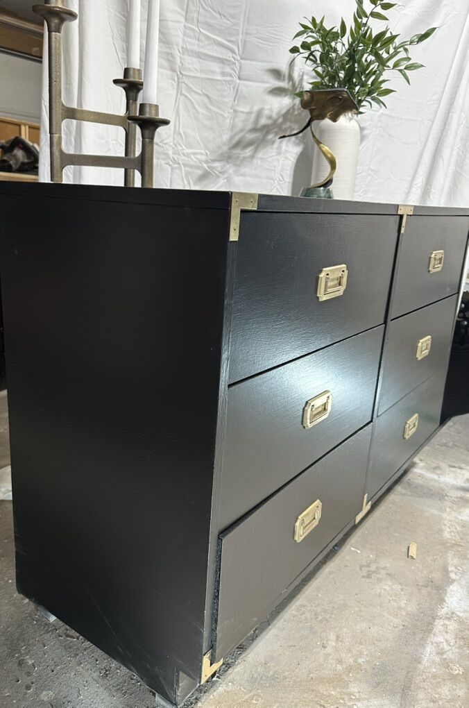 VenmoVintage fully refurbished dresser or entry table. All original brass corners and hardware fully cleaned and restored to the original shine. Body painted black. 6 drawers all a great size. Demensions 48” wide, 18” deep, 32” tall.