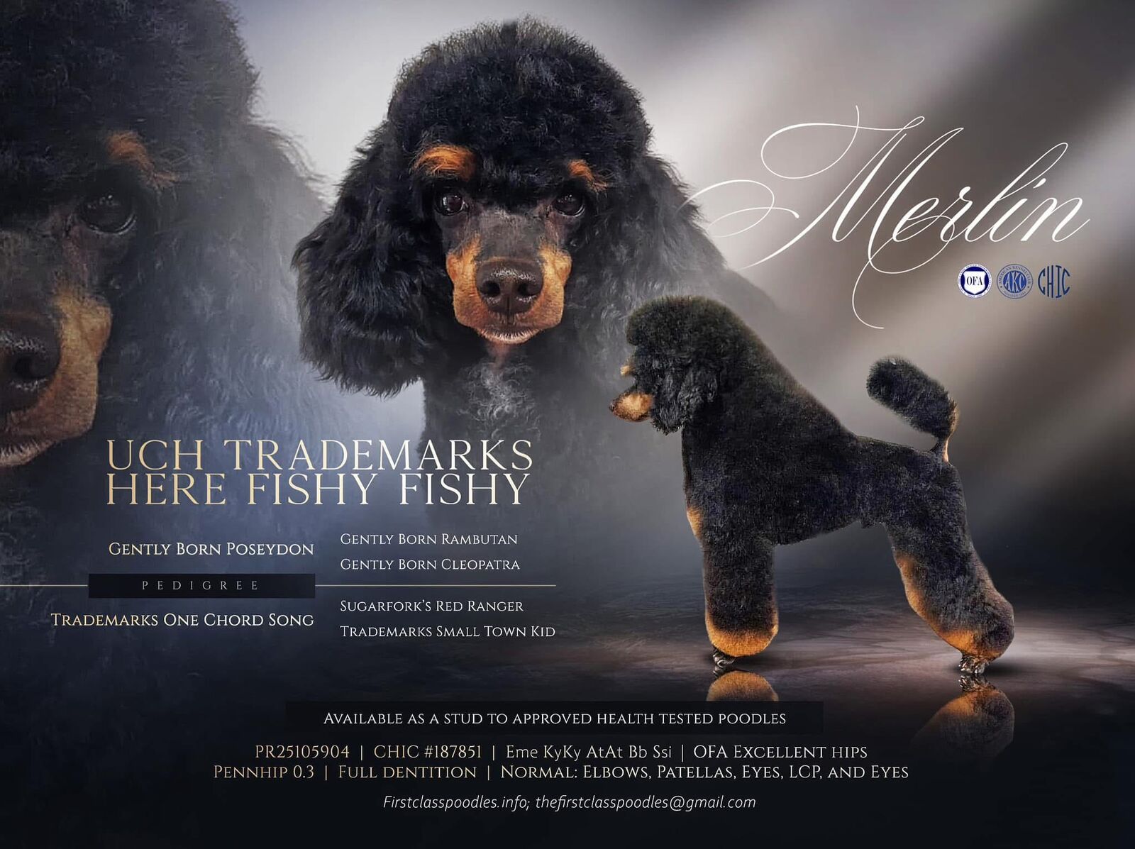ZelleMerlin is as perfect as they come. He is a true non fading phantom and produces vibrant reds. He is my prize boy, after generations of working on phantom poodles. He comes from a respected breeder from Missouri.