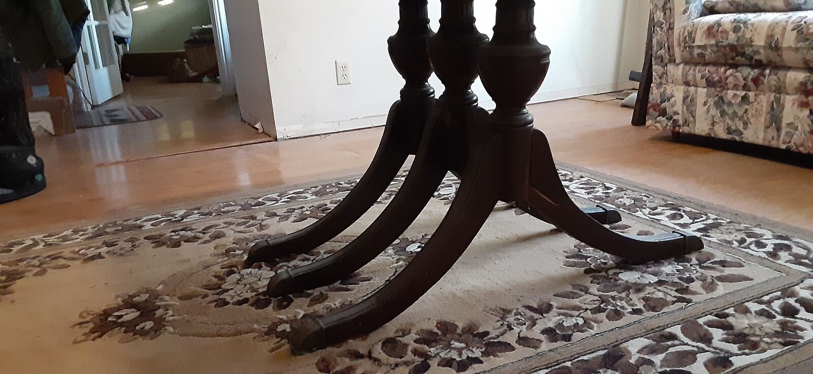 The table is sturdy overall, but one leg has a crack and will need professional repair, which is reflected in the price. No amateur repairs have been attempted. The tabletop shows normal, age-appropriate wear and presents well.