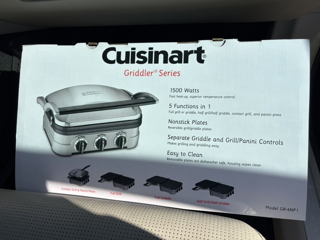 VenmoCuisinart Griddler Series Model GR-4NP1 indoor grill and panini press. It offers five functions: full grill, full griddle, half grill/half griddle, contact grill, and panini press. The unit operates at 1500 Watts and features fast heat-up and superior temperature control. It uses nonstick, reversible grill/griddle plates that are removable and dishwasher safe for easy cleaning. Separate controls allow for easy grilling and griddling.
