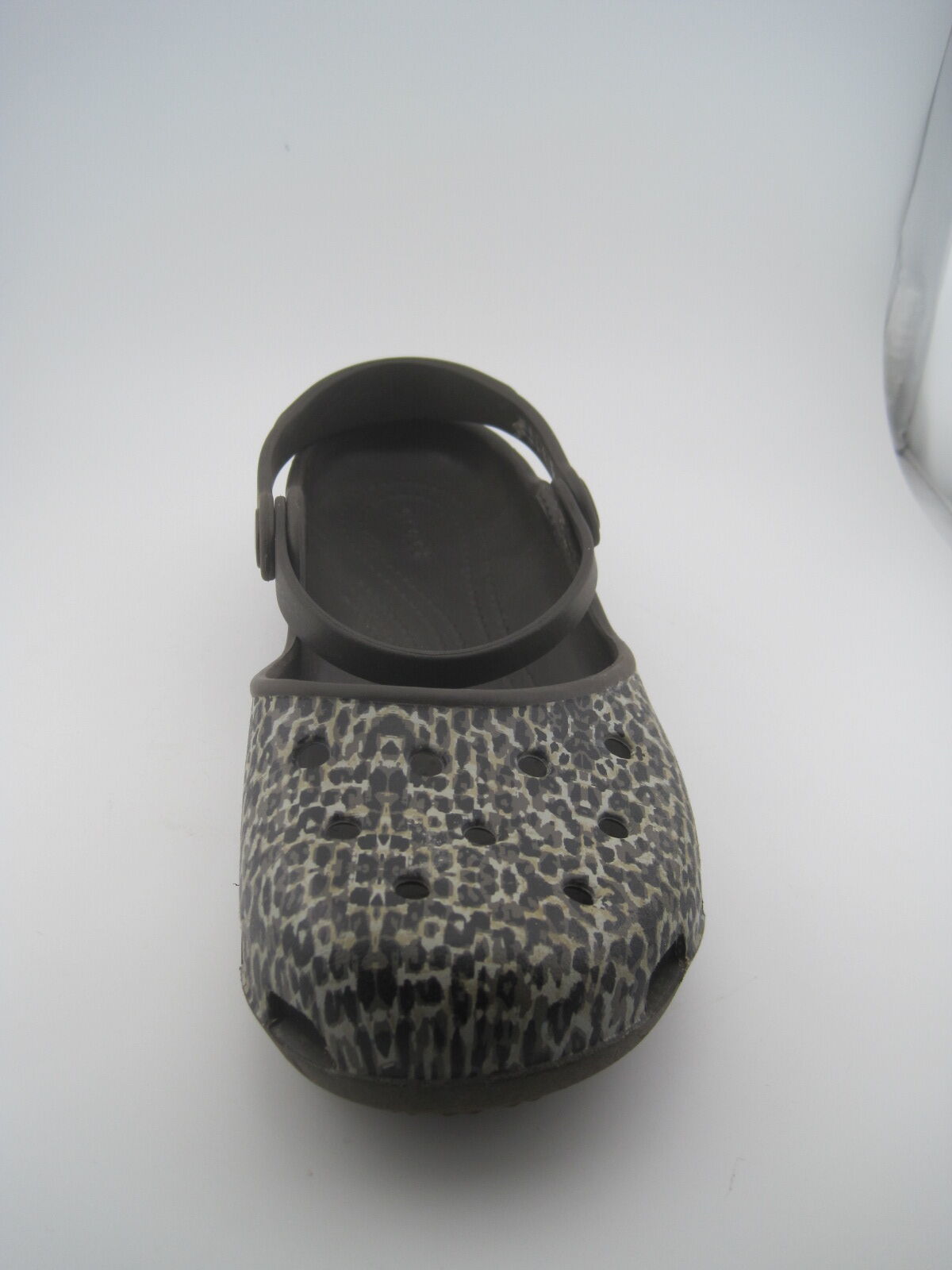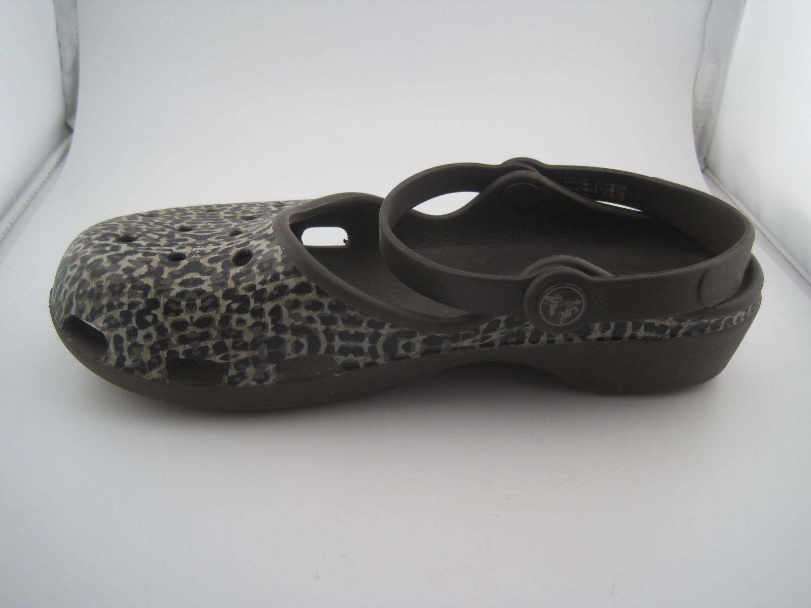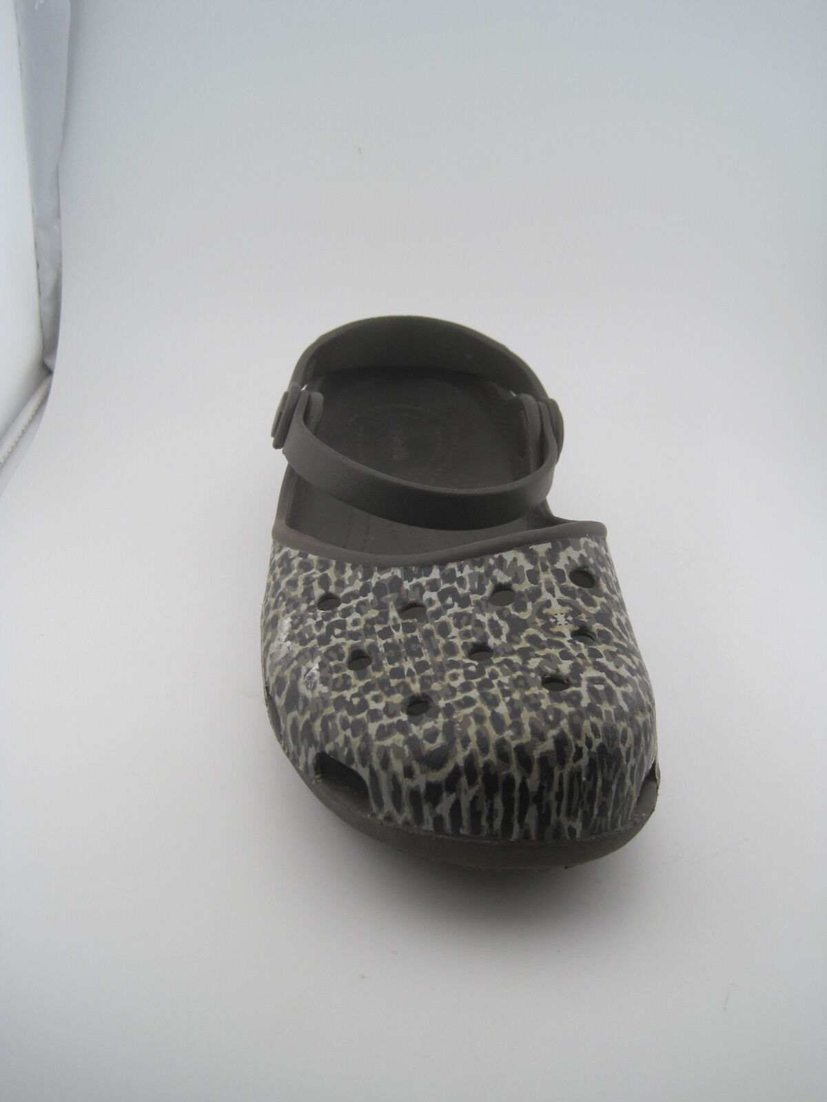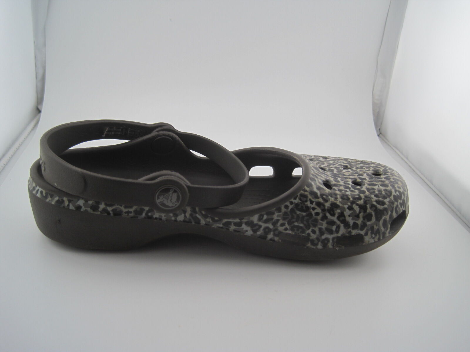 These Women’s Espresso/Brown Leopard Animal Print Crocs Karin Mary Jane Clogs in size 7 are a stylish and comfortable choice for casual wear. Featuring a round toe and slip-on closure, these clogs are lightweight with a rubber outsole and insole, making them perfect for all-day wear. The animal print pattern adds a fun and wild touch to your outfit, while the ankle strap provides extra support. Designed by Crocs, these Mary Jane clogs are a trendy choice for any woman looking to add some flair to her shoe collection.