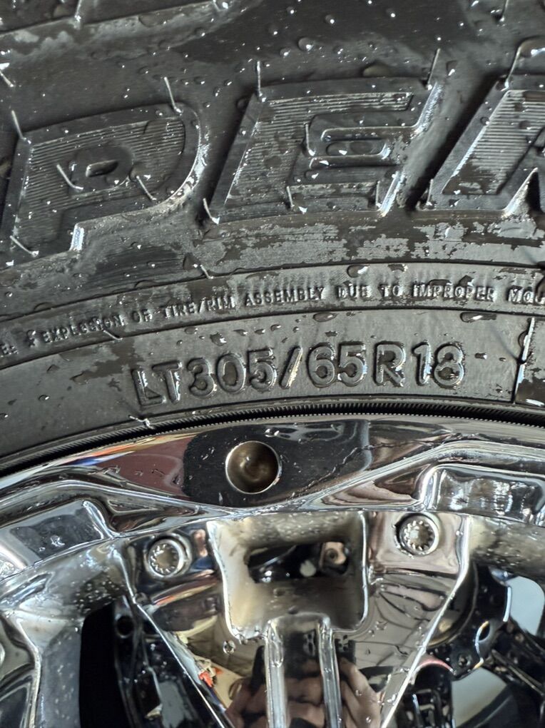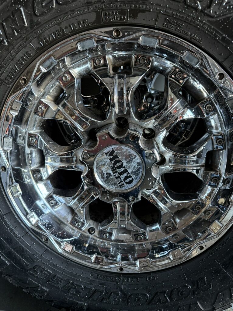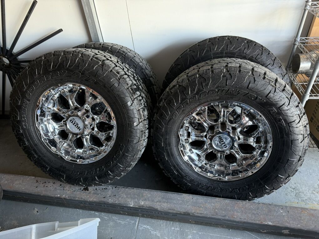 Moto metal chrome. Tires are equivalent to 33x12.5. In good shape. Wheels Have little pitting but still shine good. Bolt pattern 8x6.5 tires are like new have just under 10k miles. Toyo open country tpms and lug nuts included. Ready to go. Tires are 2500 new. Open to offers