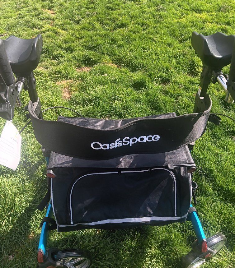 Oasis Space stand-up or sit-down walker, with armrests. Blue, brand new, with tags on.