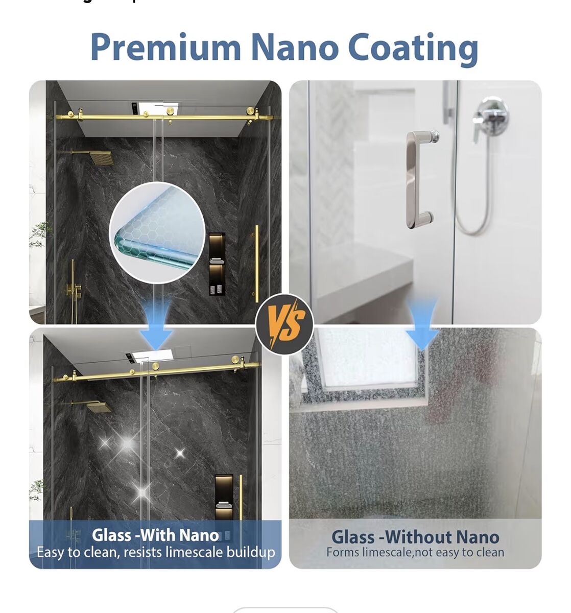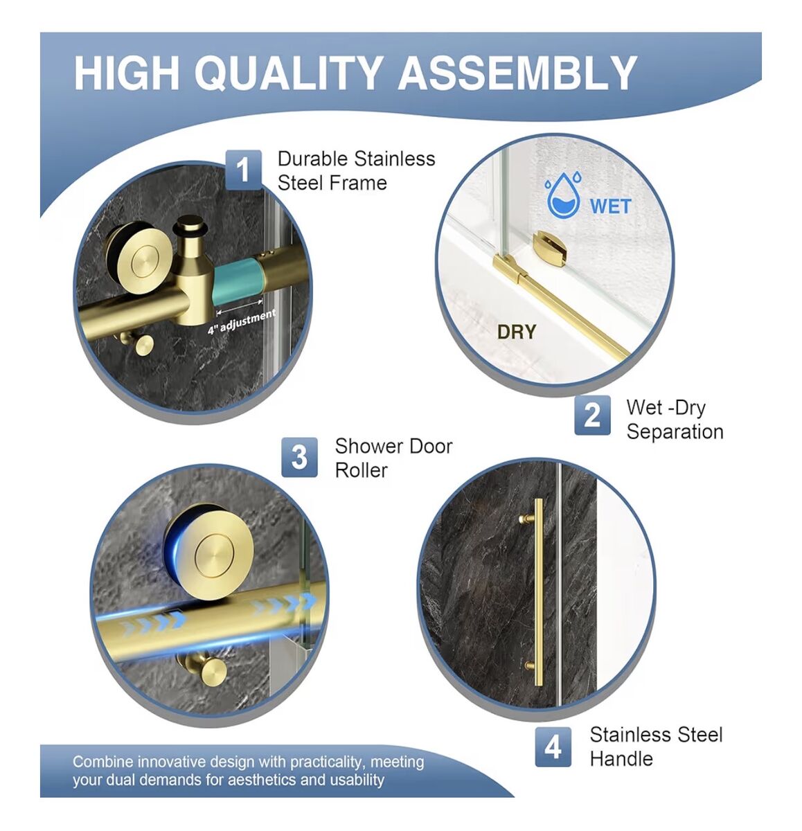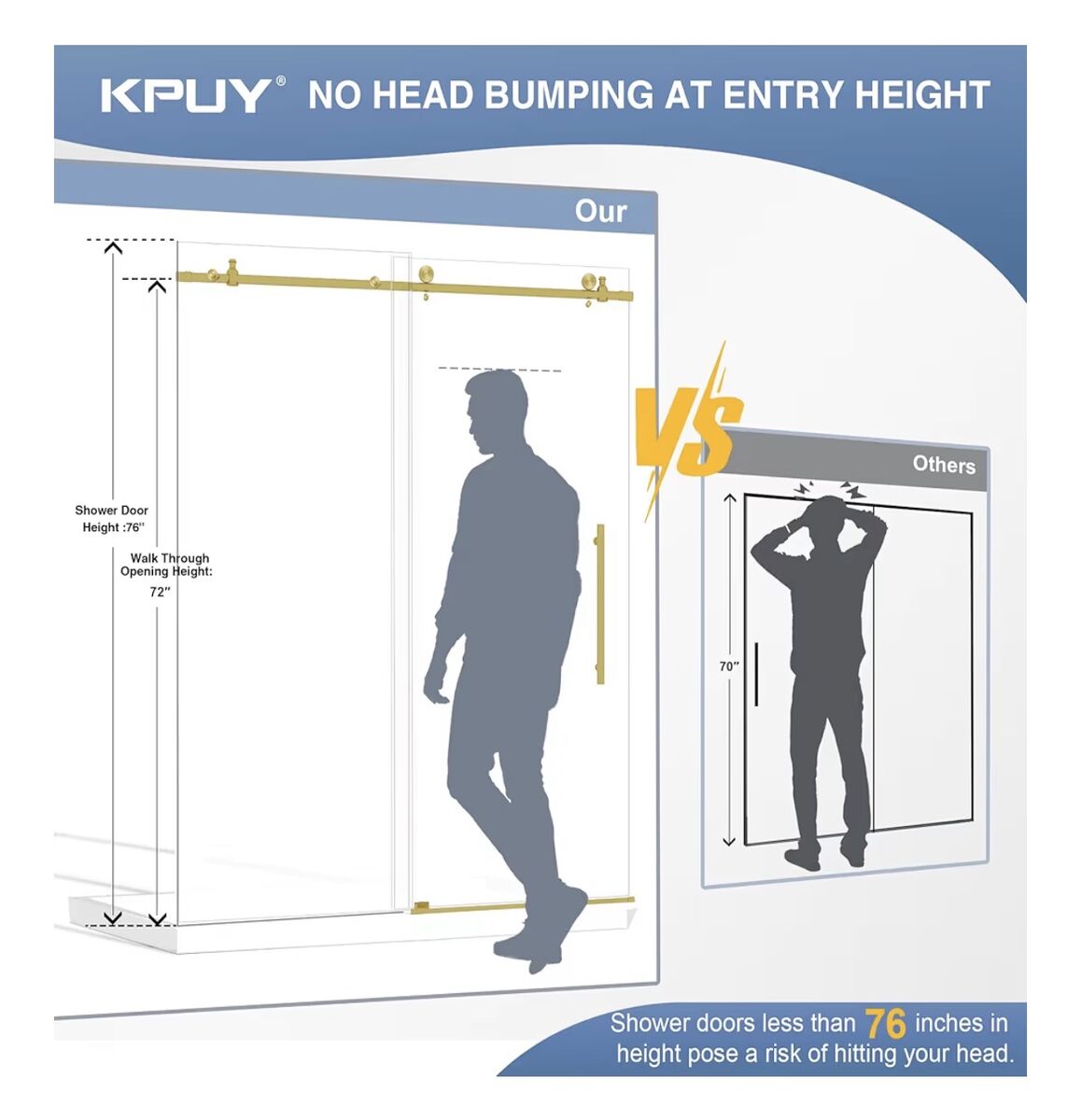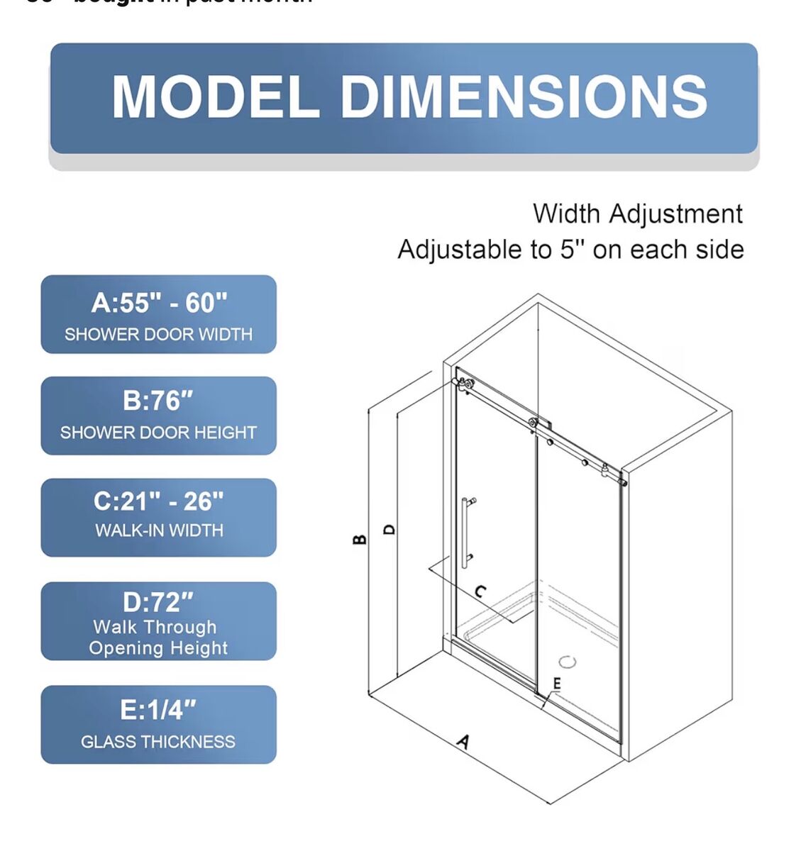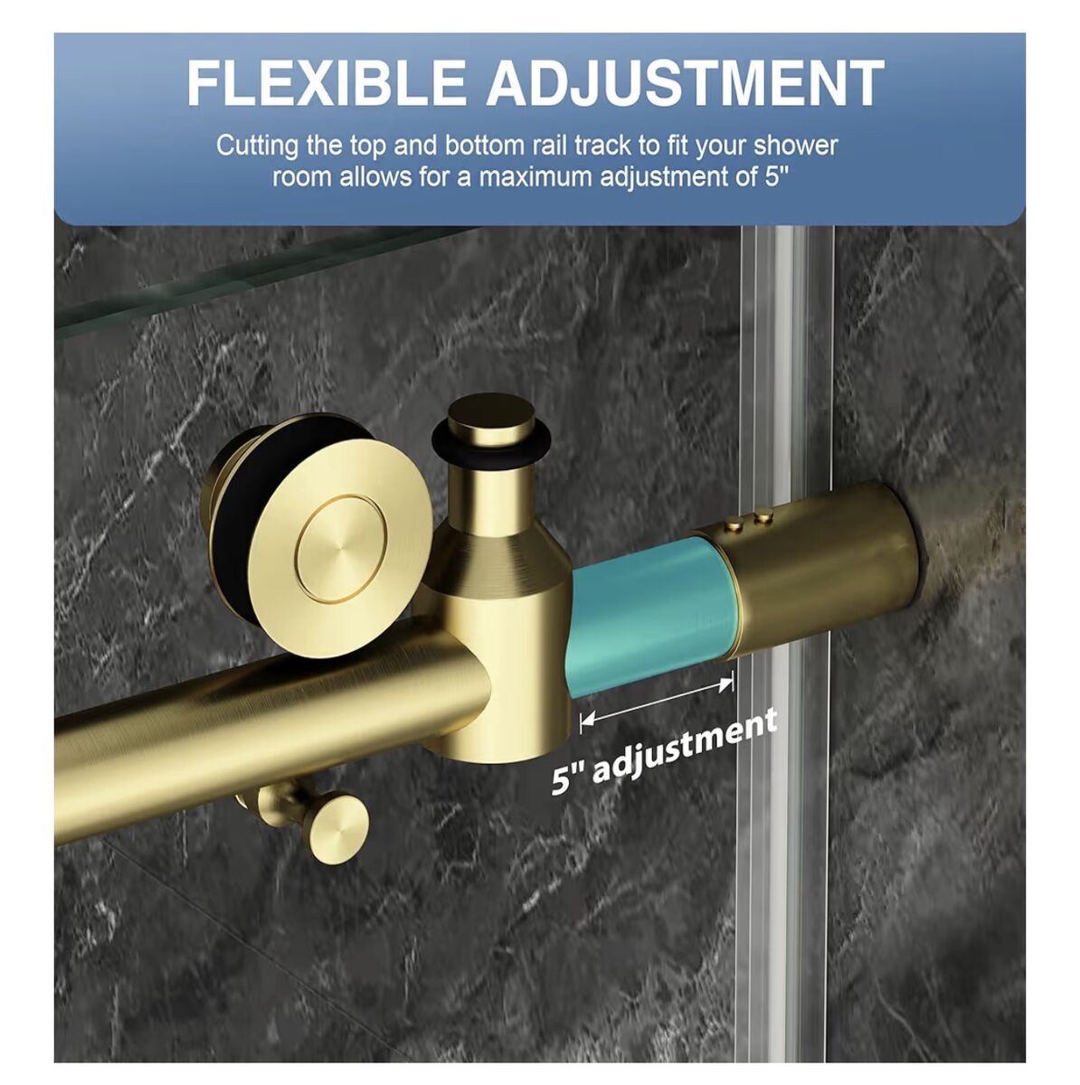 60 Shower Door60" W x 76" H. Entrance height of shower door is 72 inches to avoid the risk of hitting your head. This glass shower door features an adjustable width, offering flexibility to fit various bathroom layouts. Width Adjustment: 55" to 60" (cut top and bottom tracks to fit your needs). Elevate your bathroom with our stylish brushed gold finish shower sliding door.