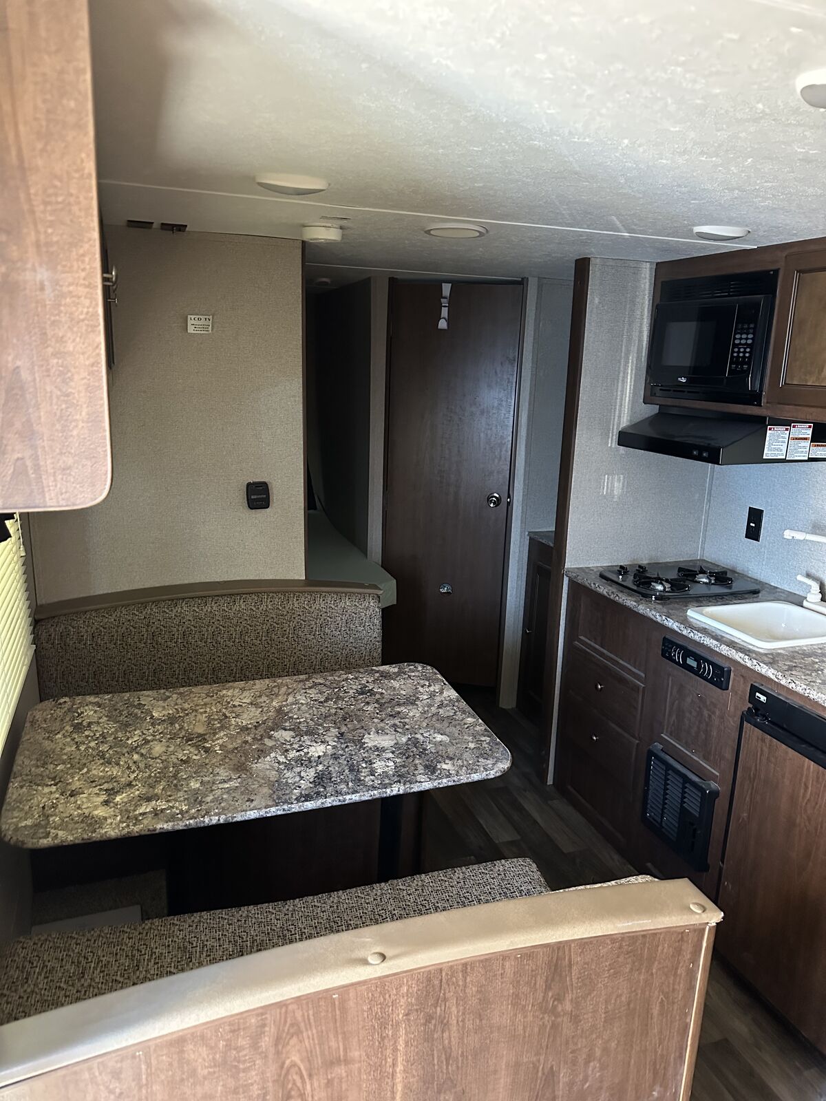 Super clean. No leaks or problems. Has been winterize. Comes with utility hook ups. Camper cover. Memory foam mattress
